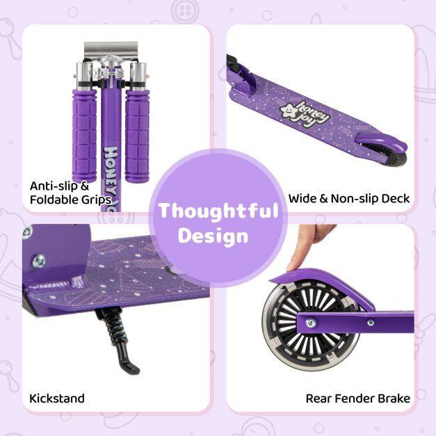 Safe and Functional Design: The wide and non-slip deck provides enough space for both feet, ensuring a more comfortable and safe riding experience. In addition, this foldable kids scooter is equipped with a kickstand and a rear fender brake for easy braking.