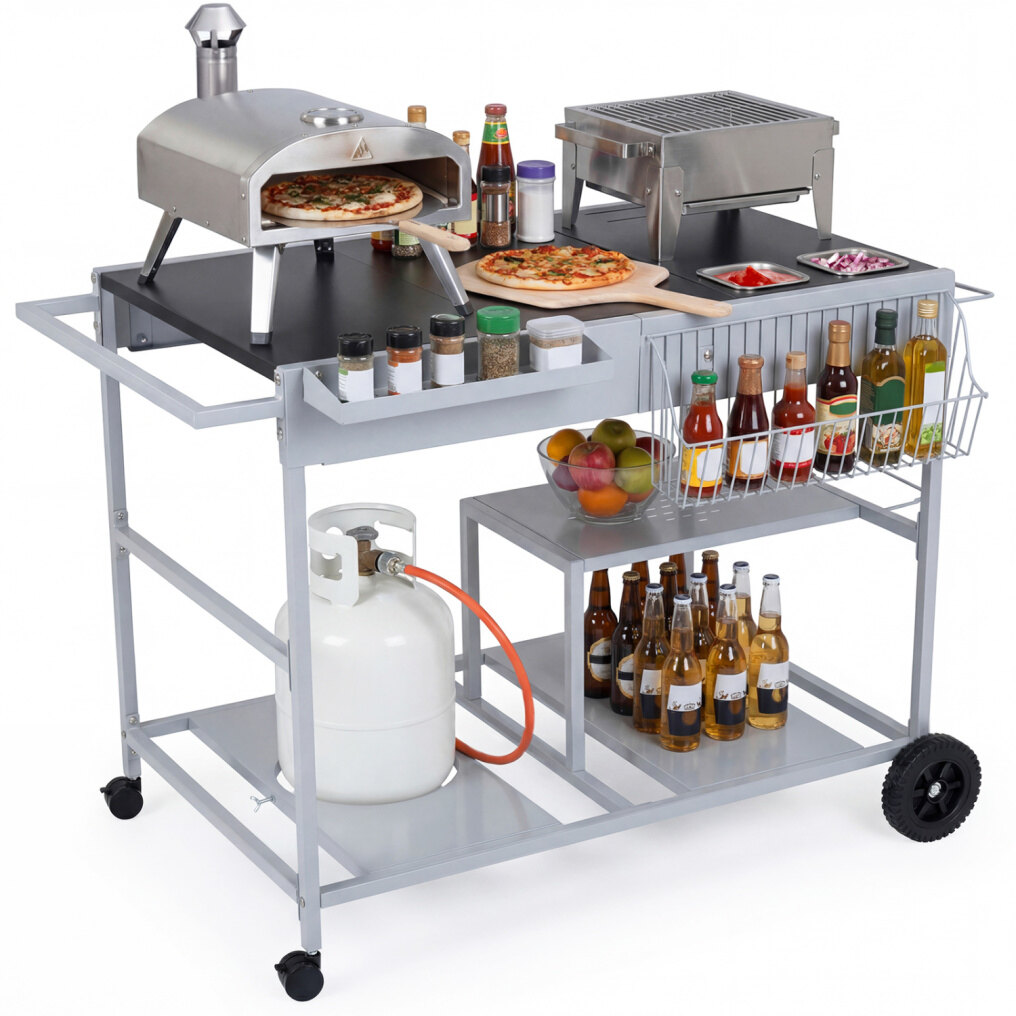 ● Spacious Prep Top: The 37.5” x 24.5” large tabletop offers a generous prep and cooking space for your outdoor setup. This pizza oven cart easily holds a pizza oven, gas griddle, portable grill, or propane stove, giving you a versatile grill station for backyard BBQs, outdoor picnics, and lively grilling parties.