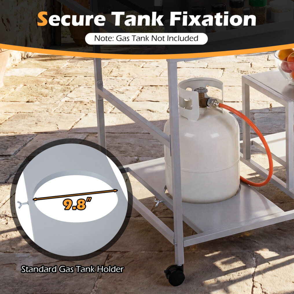 ● User-Friendly Details: This pizza oven stand includes a 9.8” standard gas tank holder underneath to keep your propane tank (not included) secure during cooking. A built-in bottle opener adds convenience, while the knife holders keep your cutting tools safely stored and ready to use.
