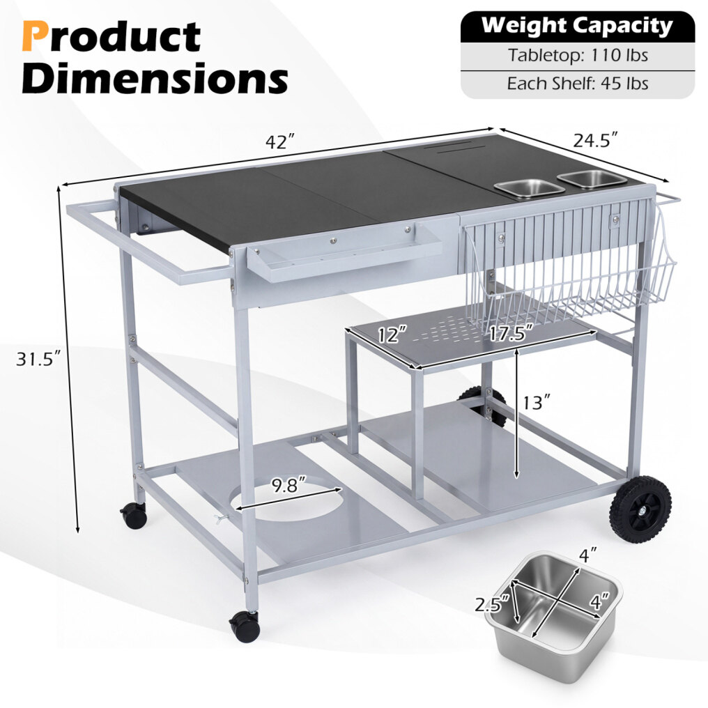 ● Strong Metal Frame: Constructed with a sturdy metal frame, this food prep station resists deformation and handles high temperatures with ease. The tabletop supports up to 110 lbs. Moreover, the condiment caddies are made of stainless steel for easy cleaning.