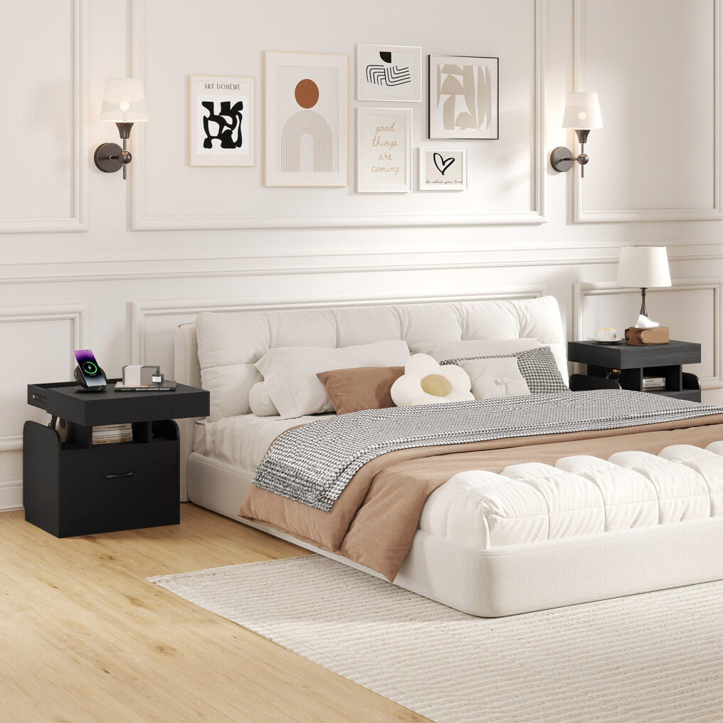 ● Convenient Charging Station: The nightstand has a charging station with 2 power outlets, 1 USB port, and 1 type-C port to keep your devices charged and accessible. The charging area is neatly integrated into the pull-out tray for a clean and organized look.
