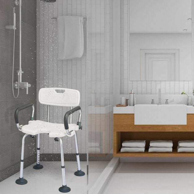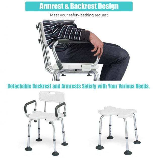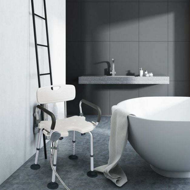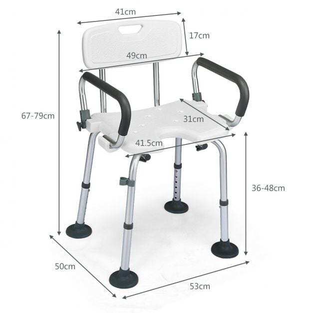 Make it easier for seniors, elderly, or people with mobility issues or recovering from an injury with our bath chair. Constructed of heavy-duty aluminum, this bath chair features an anti-skid PE seat, making it safe and durable to use in the bathroom. The wide seat and backrest, padded armrest, drainage holes and anti-slip suction cups offer added comfort when sitting for an extended period of time and safety when getting out of the chair. With an adjustable height(seat height) of 36 - 48.5cm, it offers a customized height for every user. Besides, the U-shaped seat design allows you to clean private part easily and conveniently. Moreover, the marble disassemble buckle design requires no tools. You can assemble or disassemble it in just minutes. Great for travel and storage!