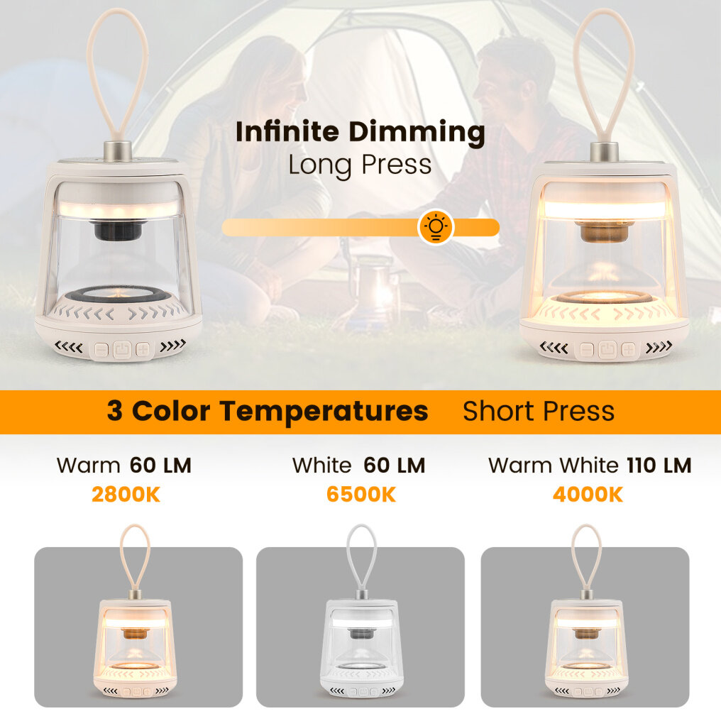 ● Light Up Your Adventures: This camping speaker lantern offers 3 soothing color temperatures (warm, white and warm white) with infinite dimming to match your mood. Moreover, the flicker RB mode adds a magical touch to your evening outings, allowing you to dive into the night.