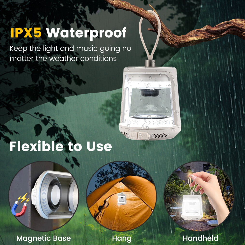 ● Made for the Outdoors: Compact (3.5" x 3") and robust with a flexible handle and a magnetic base, this IPX5 waterproof camping lantern with speaker ensures that your music and lighting stay by your side in any weather. Perfect for hiking, camping or just a chill night out in your backyard.