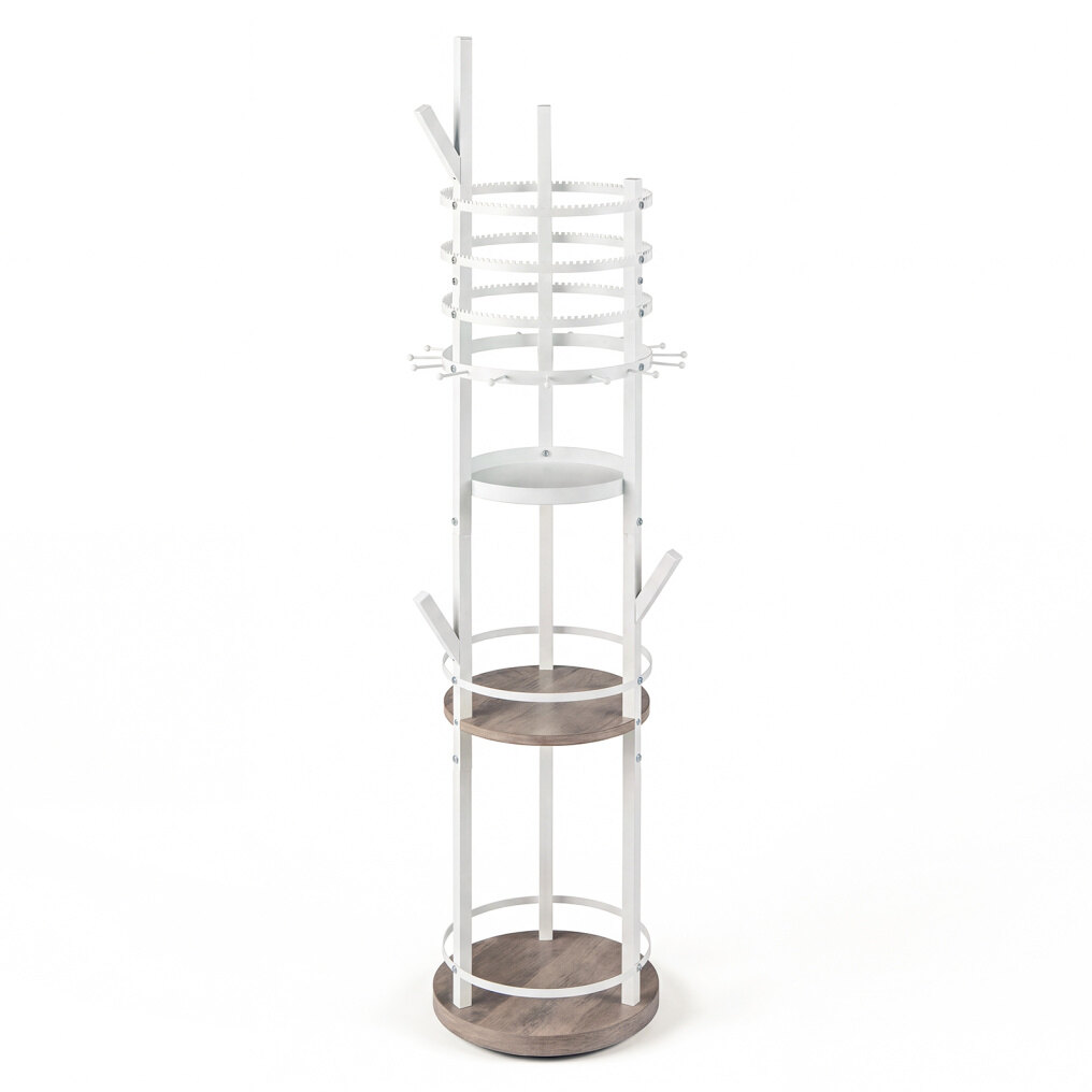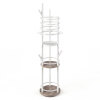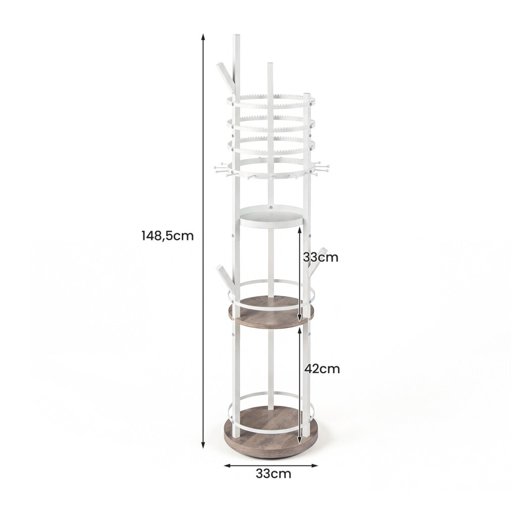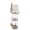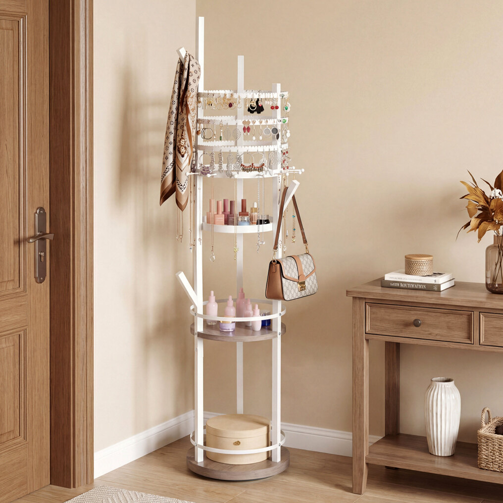 Give all your jewelry a home with our rotating jewelry organizer. This floor-standing jewelry display combines practicality and beauty with three tiers of hanging rings designed to easily store earrings, necklaces, bracelets, and handbags. The open shelves can hold cosmetics, skincare products, or other small items. This jewelry organizer features a 360° rotating frame for easy access. The sturdy metal frame, combined with the wide base, ensures a stable load without wobbling. With an elegant and versatile look, our jewelry stand is ideal for decorating your home and storing accessories.