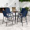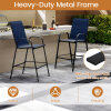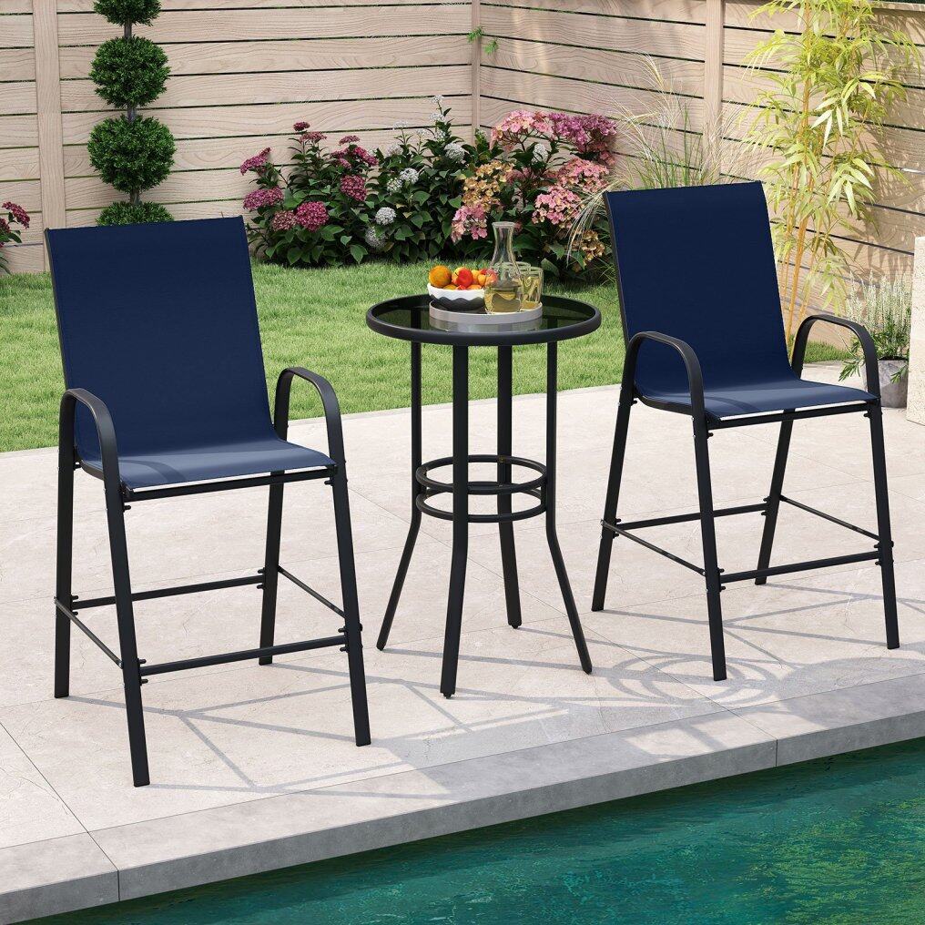 ● Ergonomic Features: Each outdoor barstool features an inclined high backrest that provides excellent back support. The curved armrests offer an ergonomic resting place for your arms and the 11.5" high footrest allows you to stretch your legs.