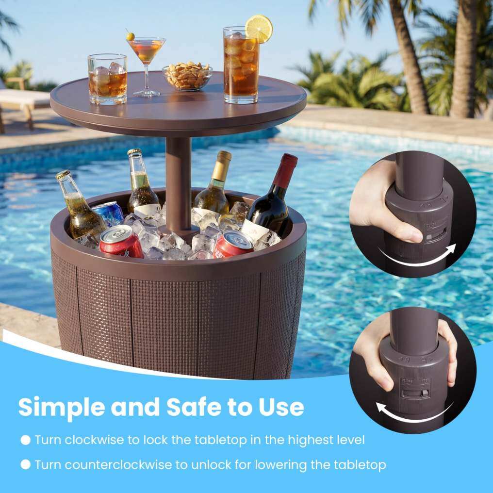Versatile 2-in-1 Design: This outdoor cooler table features a lift-top design, with the height adjustable from 59 cm as a patio coffee table to 84 cm for comfortable standing as a poolside cocktail table, providing flexibility for various social settings.