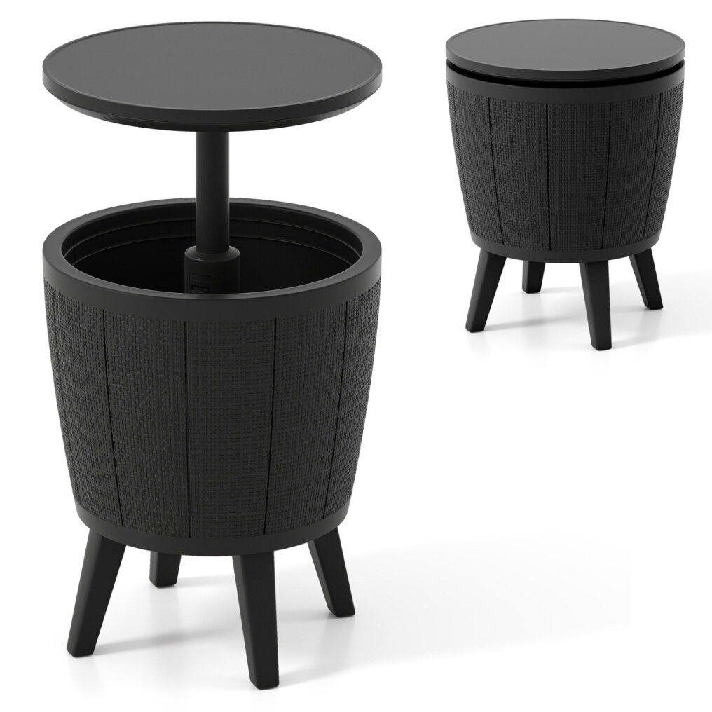 This ice chest features an 38L capacity that can hold up to 65 cans, perfect for keeping your beer and wine chilled during any event. Built with double-insulated walls and a convenient drainage hole, this cool bar table ensures drinks stay cold for up to 12 hours and allows for easy cleanup. Crafted from high-quality, all-weather PP material, the patio coffee table resists rust, fading, peeling and cracking, making it suitable for different outdoor conditions. Its adjustable lift top design offers a height range from 59 cm as a comfortable side table to 84 cm for standing use.