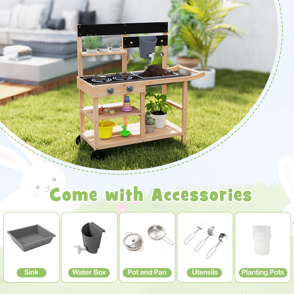 【Hassle-Free Moving】Designed with an easy-grip handle and smooth-rolling wheels, this outdoor play kitchen promises fun in the garden or backyard. The lightweight design allows kids and parents to move it effortlessly, ensuring the fun never stops.