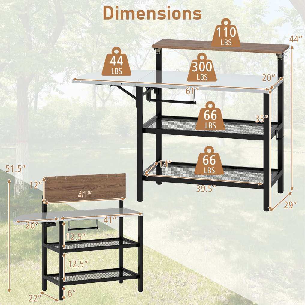 ● Space-Saving Foldable Side Table: Featuring a fan-shaped foldable side tabletop, the outdoor grill table provides additional food preparation space. When not in use, it conveniently folds down to save space, enhancing your outdoor cooking flexibility without clutter.