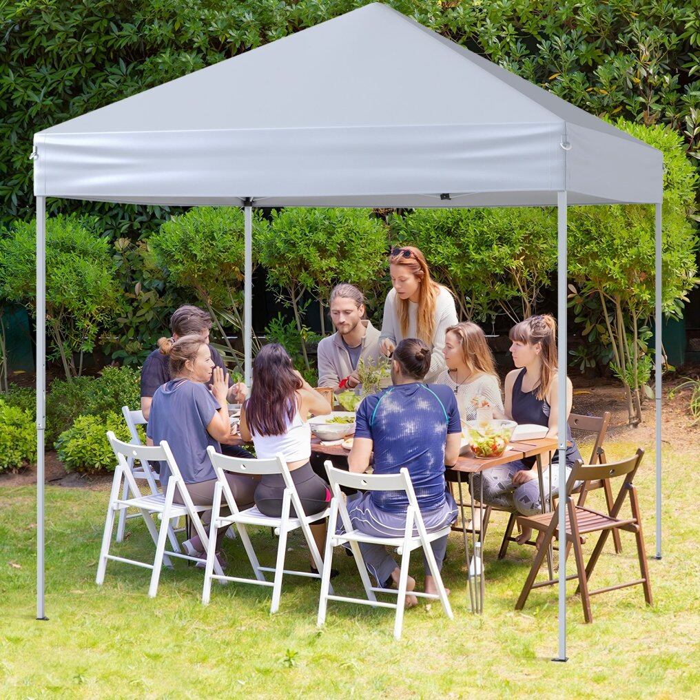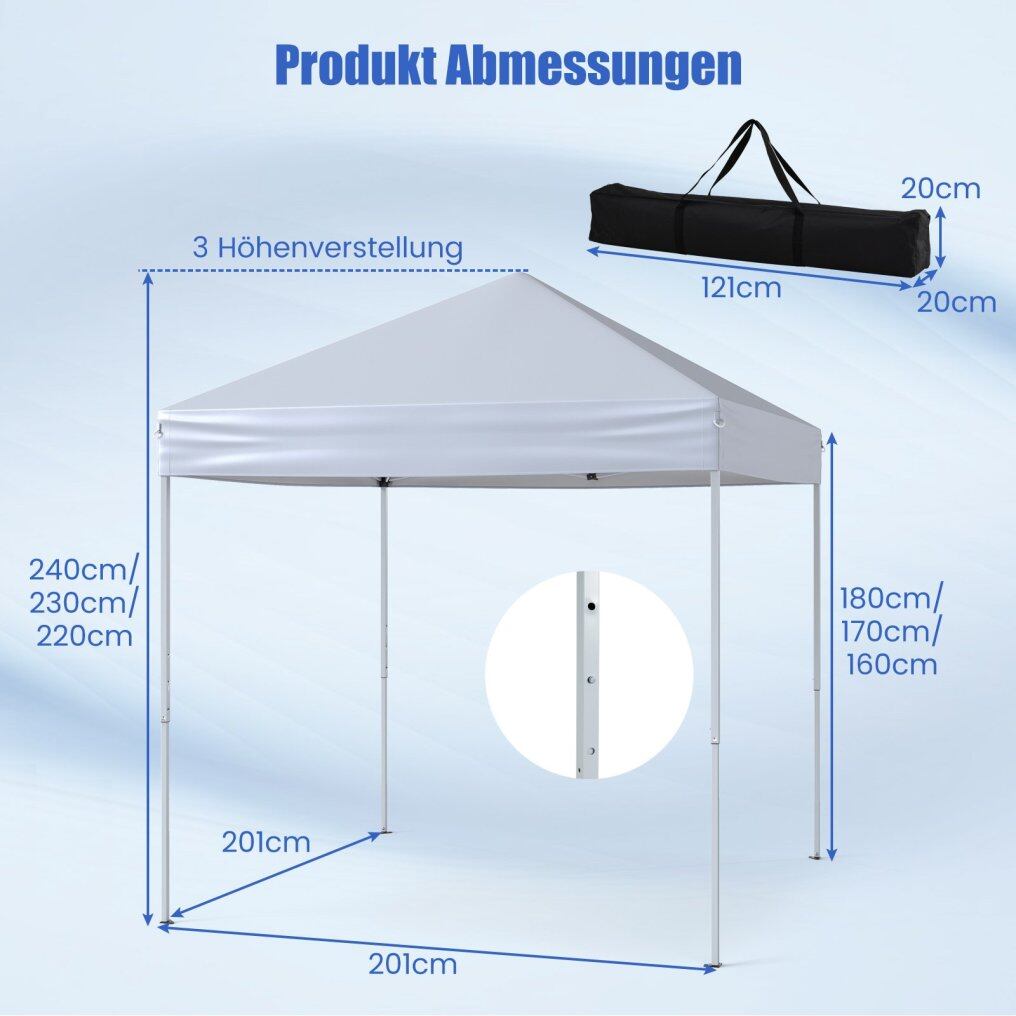 Are you looking for a reliable and versatile outdoor shelter? This pop-up canopy tent is perfect for any outdoor event. Made from reliable 210D Oxford fabric with silver coating, it offers UPF 50+ sun protection and excellent resistance to outdoor elements. The powder-coated metal frame ensures stability and includes 4 wind ropes and 8 ground stakes for added security. Its foldable design and included carry bag make it easy to transport and store. Setup is quick and easy, simply unfold the frame, attach the canopy, and adjust the height. With adjustable height from 220 cm to 240 cm, this outdoor shelter suits a variety of needs, whether for parties, BBQs, camping, or flea markets.
