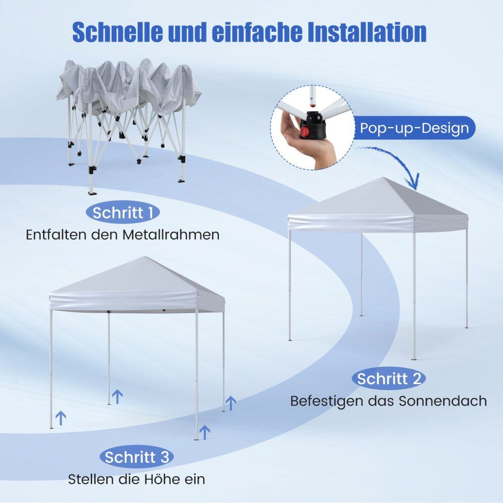 Quick and Easy Installation: Setting up your instant commercial tent is a breeze! Follow these simple steps: Step 1: Unfold the metal frame. Step 2: Attach the canopy top. Step 3: Adjust the height. With a convenient pop-up design, you can have your height-adjustable tent ready to use in just a few minutes.