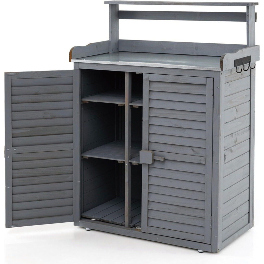 Enhance your gardening experience with this versatile potting bench. Featuring a spacious work surface, a cabinet with removable shelves, and three hanging hooks, it keeps tools easily accessible and organized. Made from solid fir wood, it guarantees a robust construction to withstand outdoor conditions. Its worktop is made of rust-resistant, waterproof, and easy-to-clean galvanized panels. The ventilated louvered doors are equipped with a magnetic latch, and the four adjustable feet keep it stable on uneven ground.