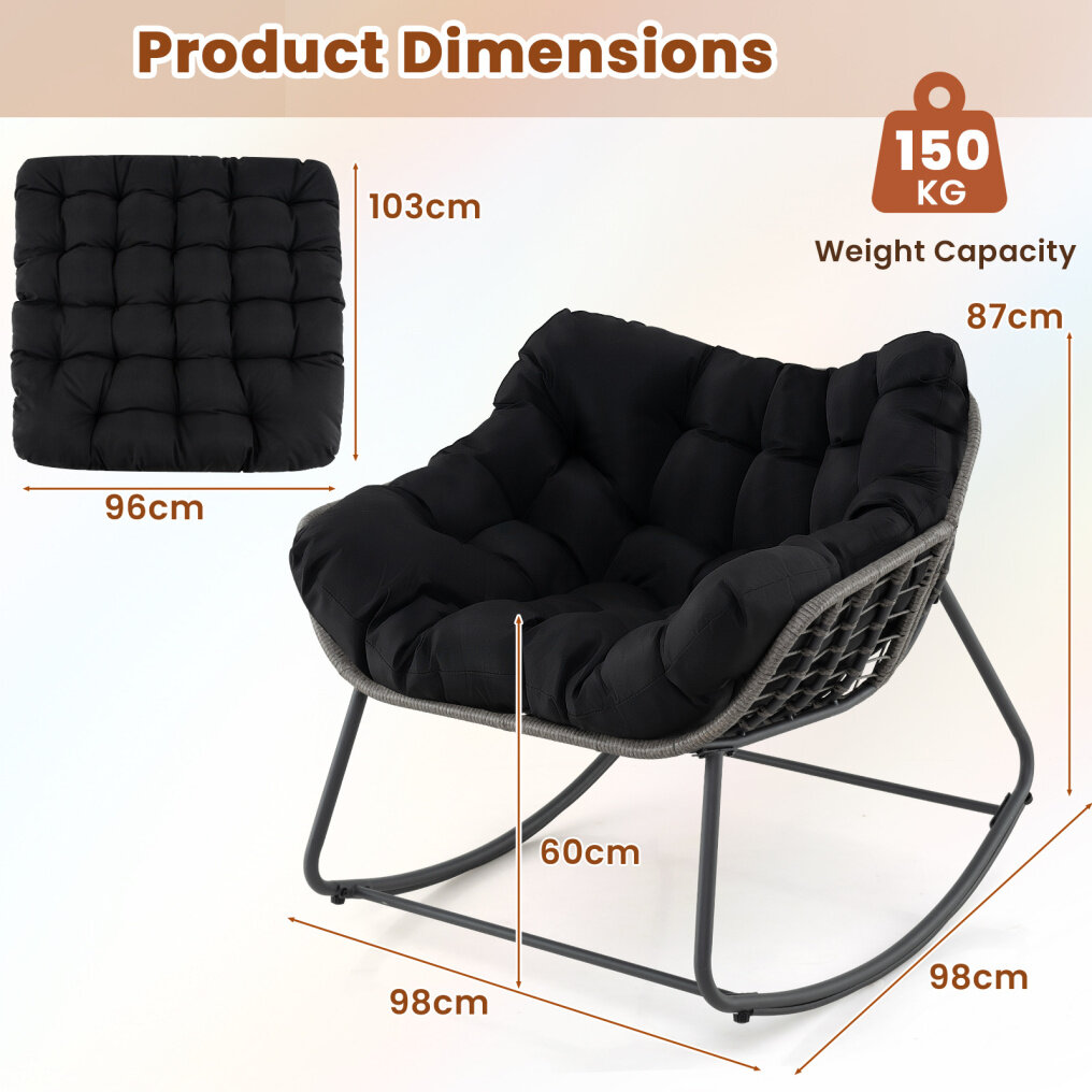 This oversized rocking egg chair offers an inviting look with its hand-woven PE wicker detailing, which is a perfect addition to your home or outdoor areas. It comes with a thick and soft cushion, adding an extra layer of comfort. The gentle rocking function makes your relaxation time even more enjoyable. Moreover, the chair is equipped with stopper foot pads and non-slip rubber strips at the bottom to enhance overall safety when you're rocking. Crafted with a robust metal frame, this outdoor lounge chair is built to support up to 150 kg, ensuring stability and long-lasting use.