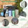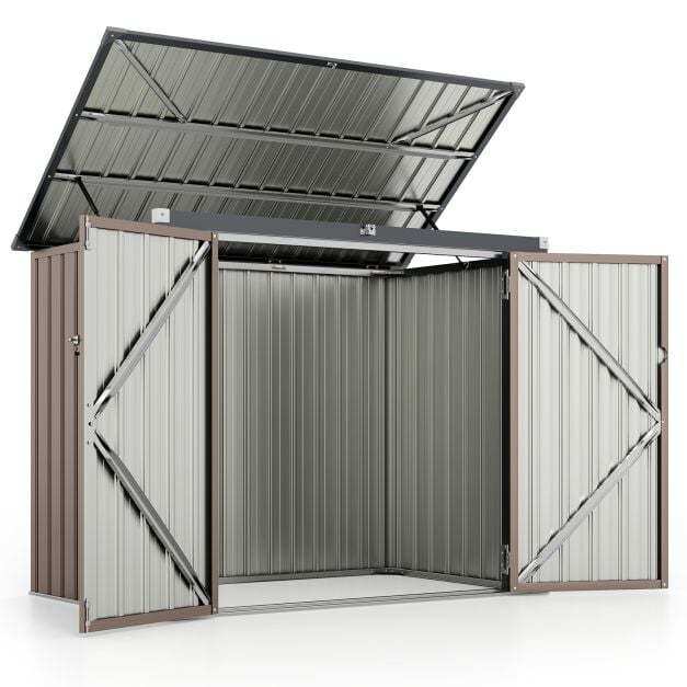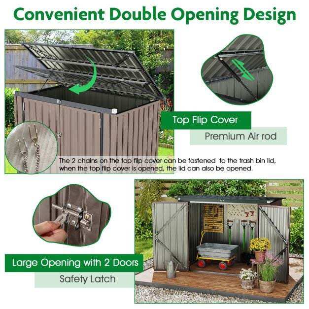 The 2 opening doors offer additional flexibility, making it ideal for various scenarios including gardens, poolsides, and backyards. For more convenience, this trash bin shed comes with 2 chains on the top flip cover, which can be fastened to the trash bin lid, when the top flip cover is opened, the lid can also be opened. Besides, crafted from galvanized steel, this trash can storage shed is built to withstand harsh weather conditions, protecting your belongings all year round. The reinforced triangular structure and corner protectors ensure stability and safety, while the safety latch on the doors adds an extra layer of security. With minimal maintenance required and dimensions of 172 x 95 x 130 cm, this shed is the perfect fit for most occasions.