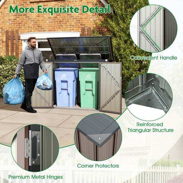 Stable Frame & Safe Designs: The trash can storage shed boasts a reinforced triangular structure for stability and corner protectors for added safety. Besides, the safety latch on the doors provides an extra layer of security, keeping your belongings safe.