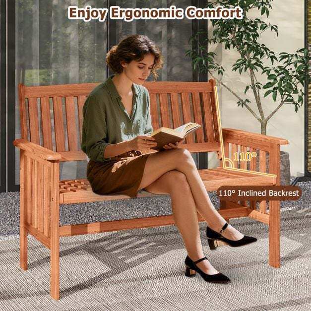 ● Cozy Seating Experience: With an ergonomically designed 110° inclined backrest, cozy armrests and a breathable slatted seat, this outdoor wooden bench offers both support and ventilation for maximum comfort during extended use.