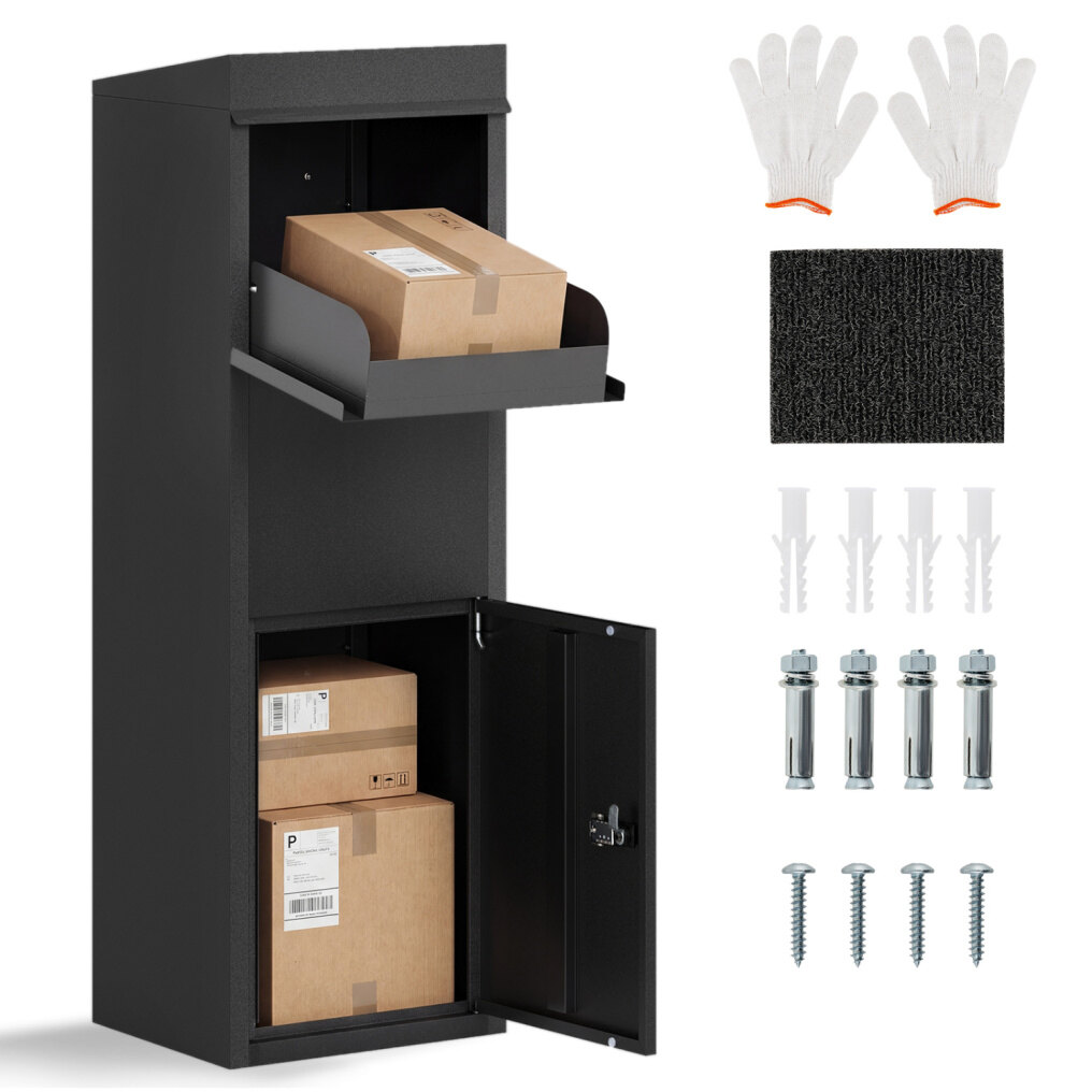 ● Easy and Stable Installation Options: Equipped with pre-drilled mounting holes on back and bottom for wall and floor anchoring, this package drop box ensures a stable setup wherever needed. Its versatile design allows installation on porches, yards, curbside areas, or offices, offering flexible placement options.