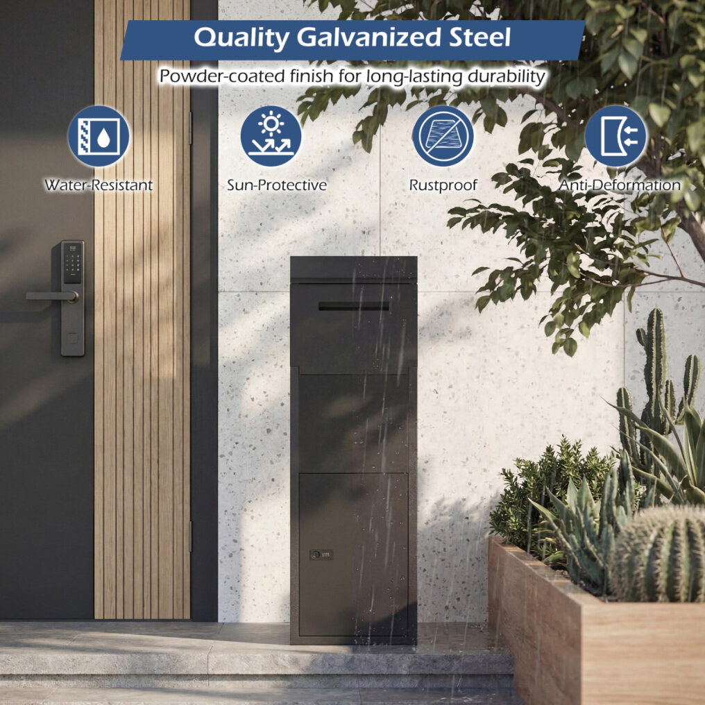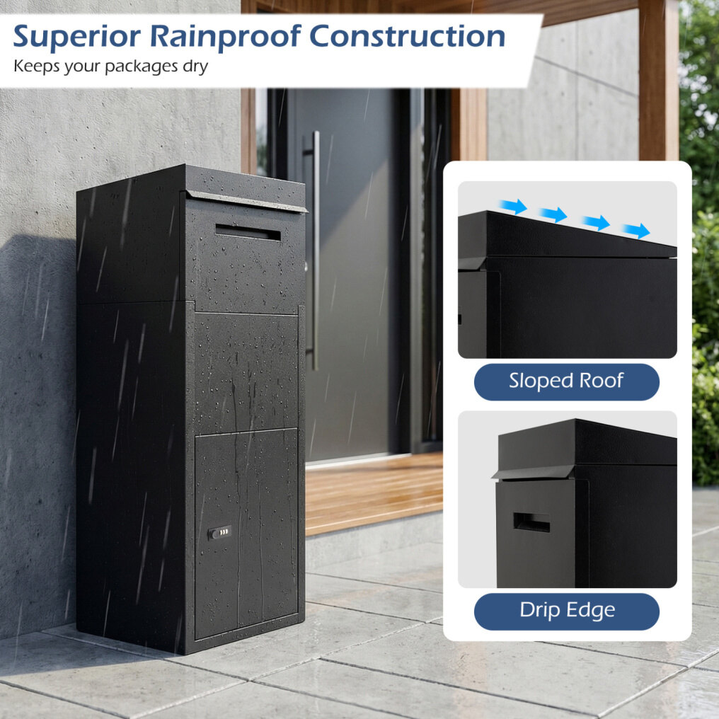 ● Waterproof Galvanized Steel Construction: Crafted from sturdy galvanized steel with a powder-coated finish, the outdoor parcel drop box is rustproof, anti-deformation, water-resistant and sun-protective, ensuring lasting durability. Moreover, the sloped roof and drip edge offer exceptional rainproof protection.