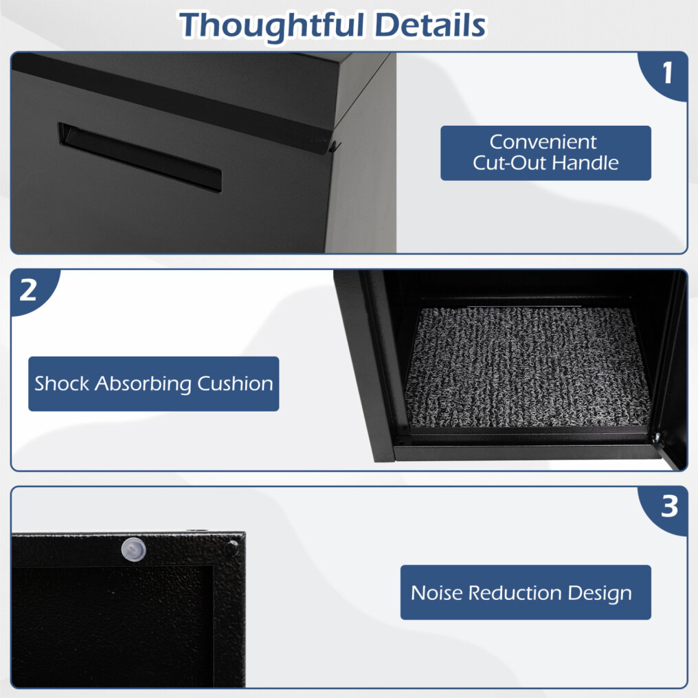 ● Thoughtful Details: The pickup compartment includes a shock-absorbing cushion that minimizes impact, protecting packages from dents and damage. Additionally, this parcel delivery box features a noise reduction design on the door for quiet operation.