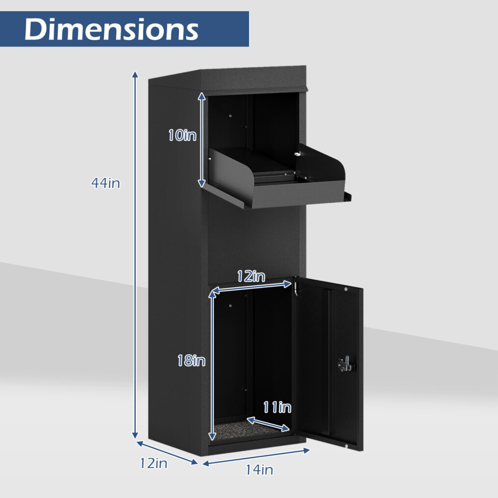 ● Generous Storage Capacity: Designed to accommodate large packages, letters, and magazines, this parcel delivery box offers a roomy pickup compartment measuring 12" x 11" x 18" (W x D x H). The generous interior size makes it an ideal solution for handling multiple deliveries of various shapes and sizes.