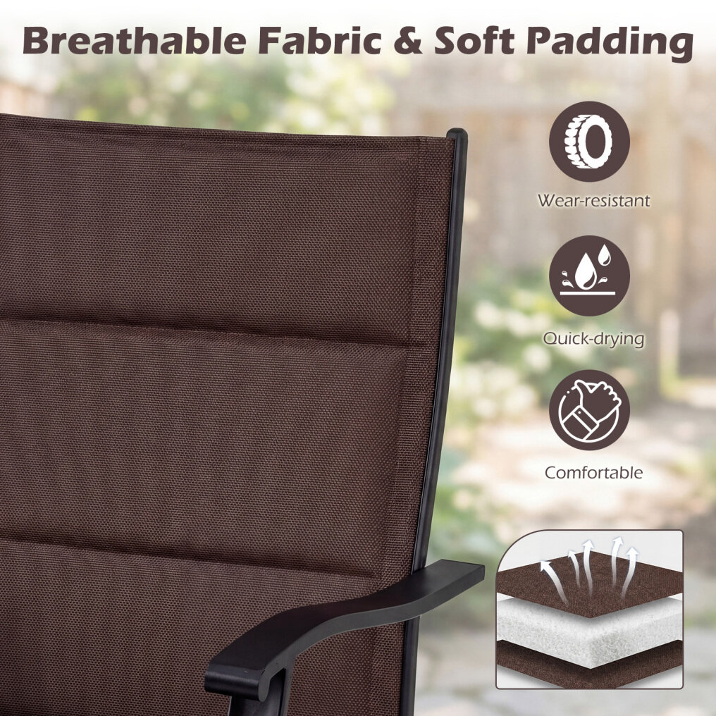 ● Sturdy Construction: Built with a heavy duty metal frame, these patio dining chairs ensure exceptional strength and load capacity. Each chair comes with 6 anti-slip foot pads, offering additional stability on various surfaces.
