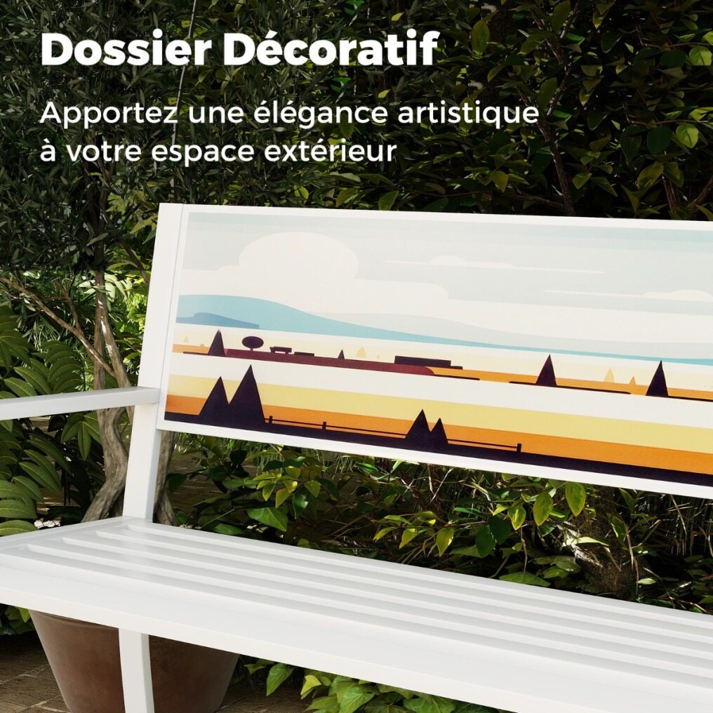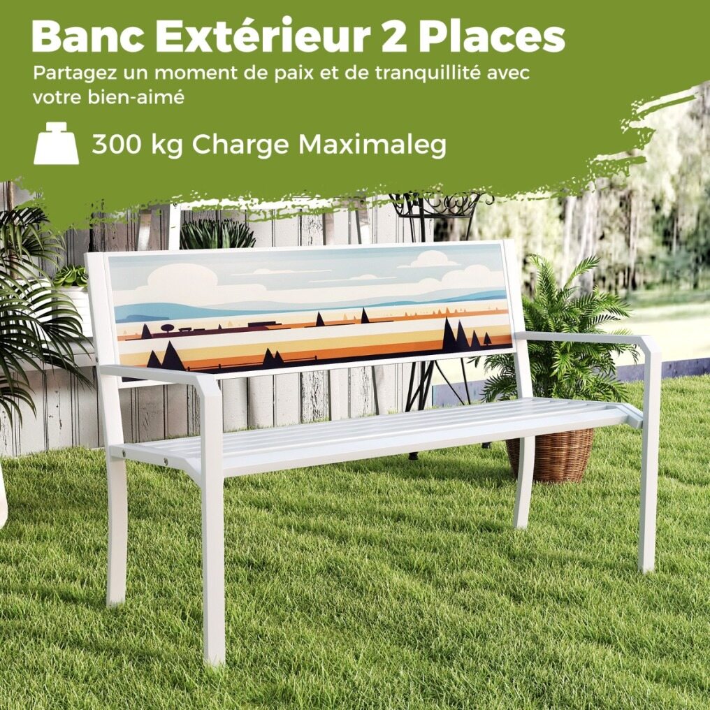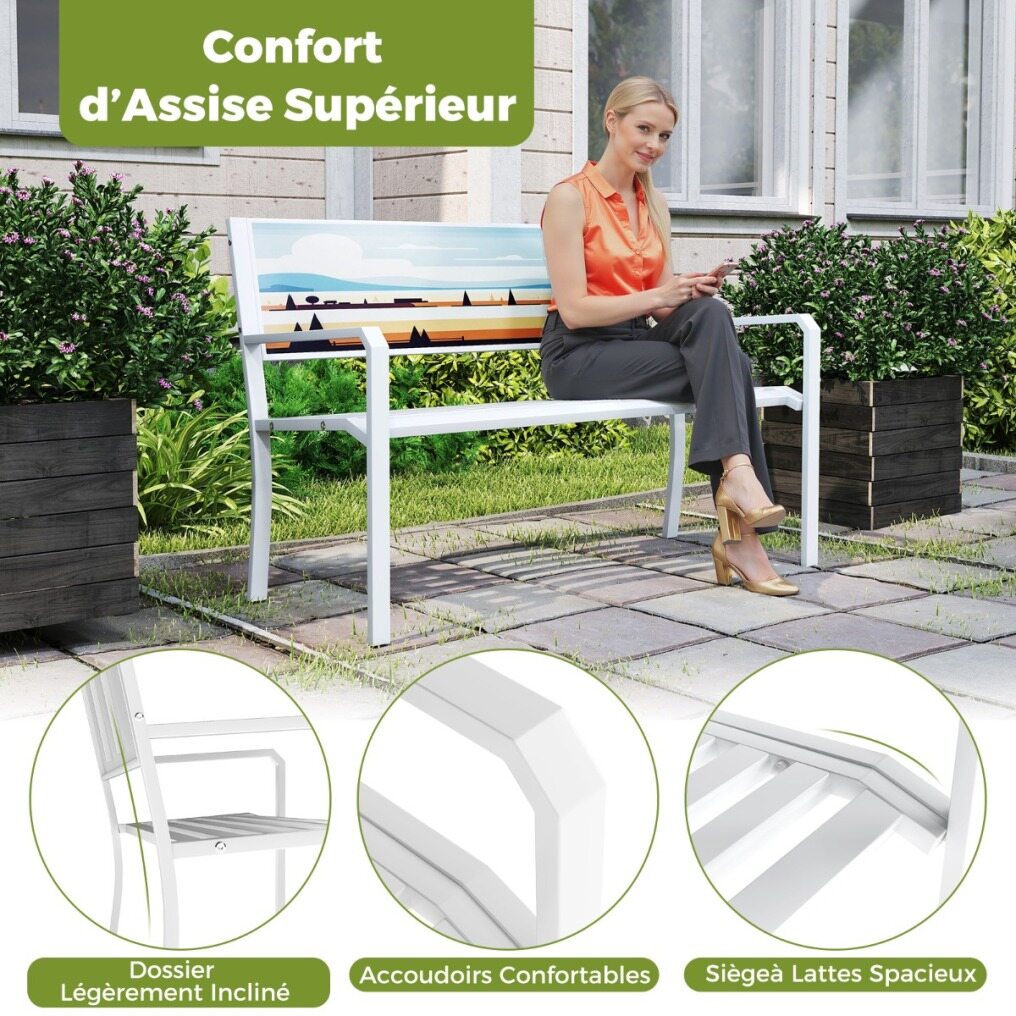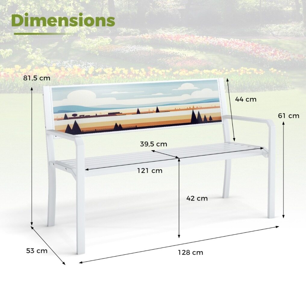 Decorative Backrest: The 2-seater outdoor bench features a decorative backrest with a beautiful landscape painting. It adds a touch of artistic elegance, enhancing the overall ambiance of any outdoor space.