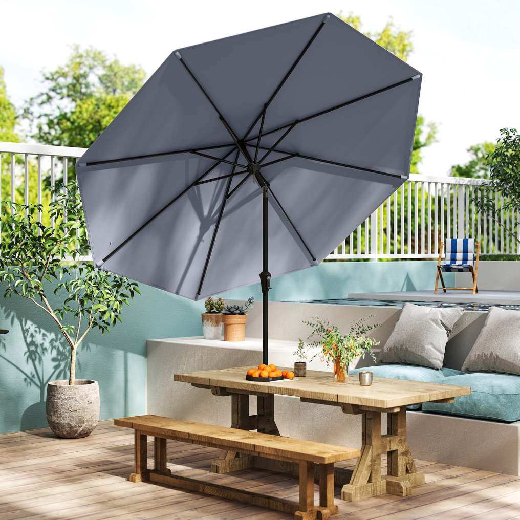 The patio umbrella is designed with a PA-coated polyester canopy that not only provides excellent sun protection but is also wear-resistant. The 270cm umbrella is equipped with a tilt mechanism that allows you to adjust the shade angle according to the sun's position. Equipped with 8 strong ribs and a thick metal pole, this large outdoor umbrella is extremely stable. In addition, the safety pin ensures accident-free use.