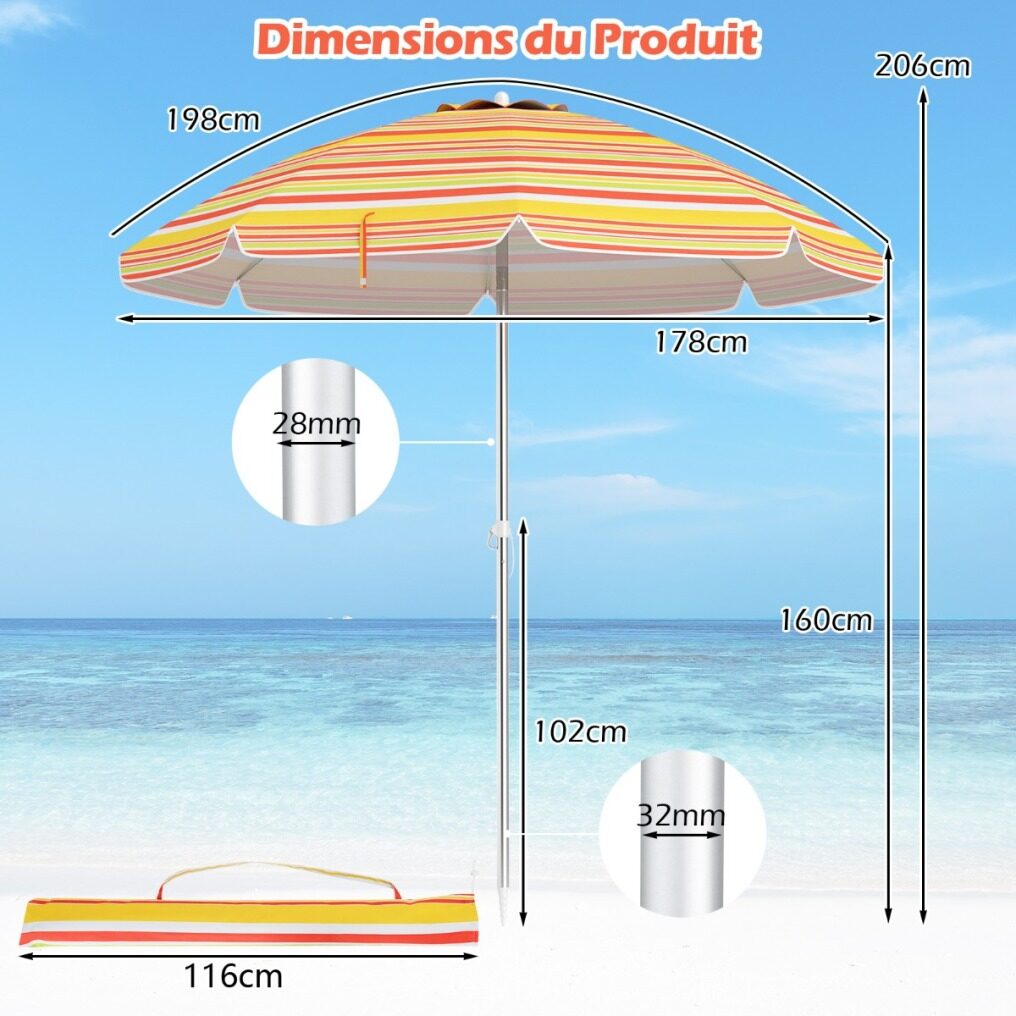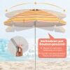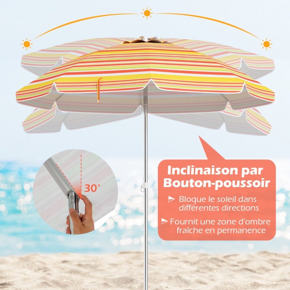 Made with a polyester canopy and silver coating, this 198cm beach umbrella is a barrier against most of the sun's harmful rays. Its convenient push-button tilt function allows you to easily adjust the shade as the sun's position changes. Attachment is simple with a built-in sand anchor and aluminum bolt. Its sturdy design is further enhanced by the rust-proof aluminum pole and strong fiberglass ribs. It's also a great choice for parks, gardens, or any outdoor gathering!