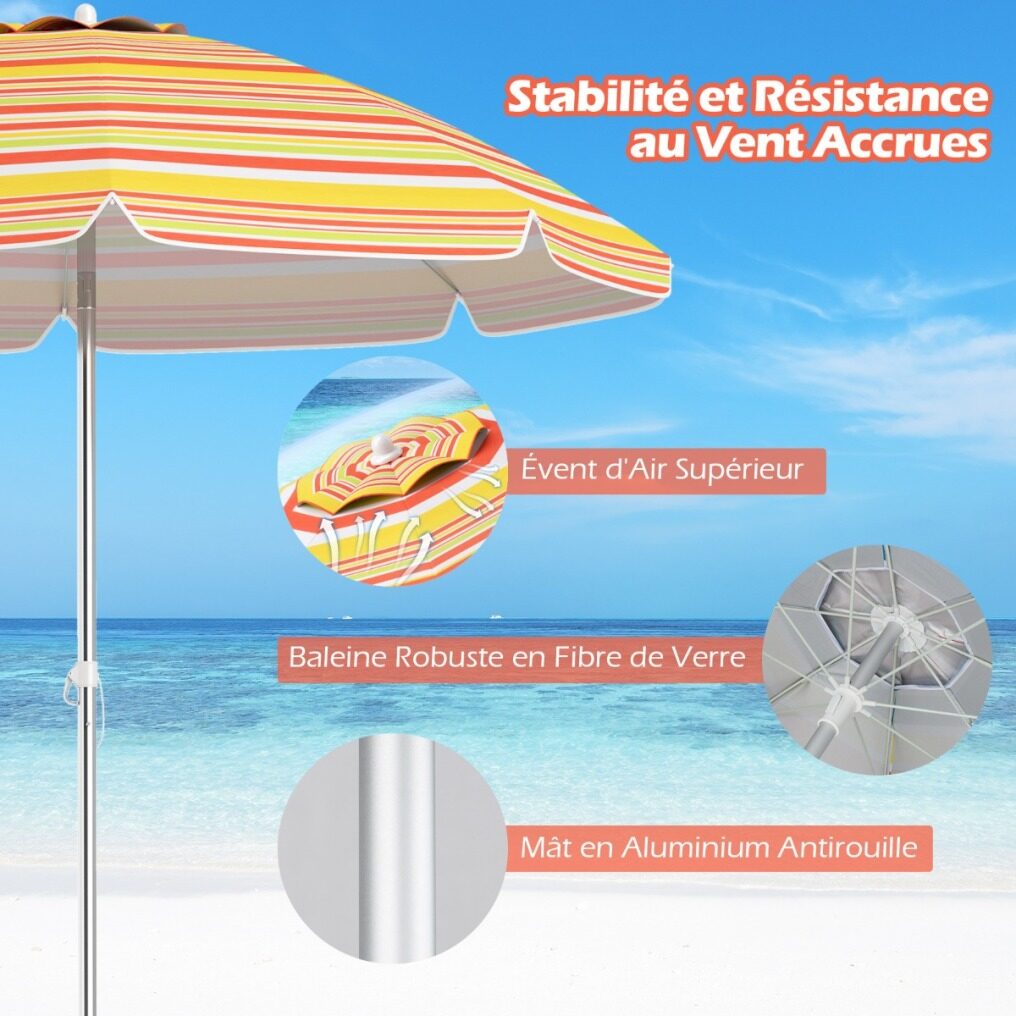 【Enhanced Stability and Wind Resistance】Equipped with a top vent, this beach umbrella facilitates air circulation while improving stability against unexpected gusts. In addition, supported by sturdy fiberglass ribs and rust-proof aluminum pole, it ensures excellent reliability and durability.