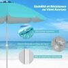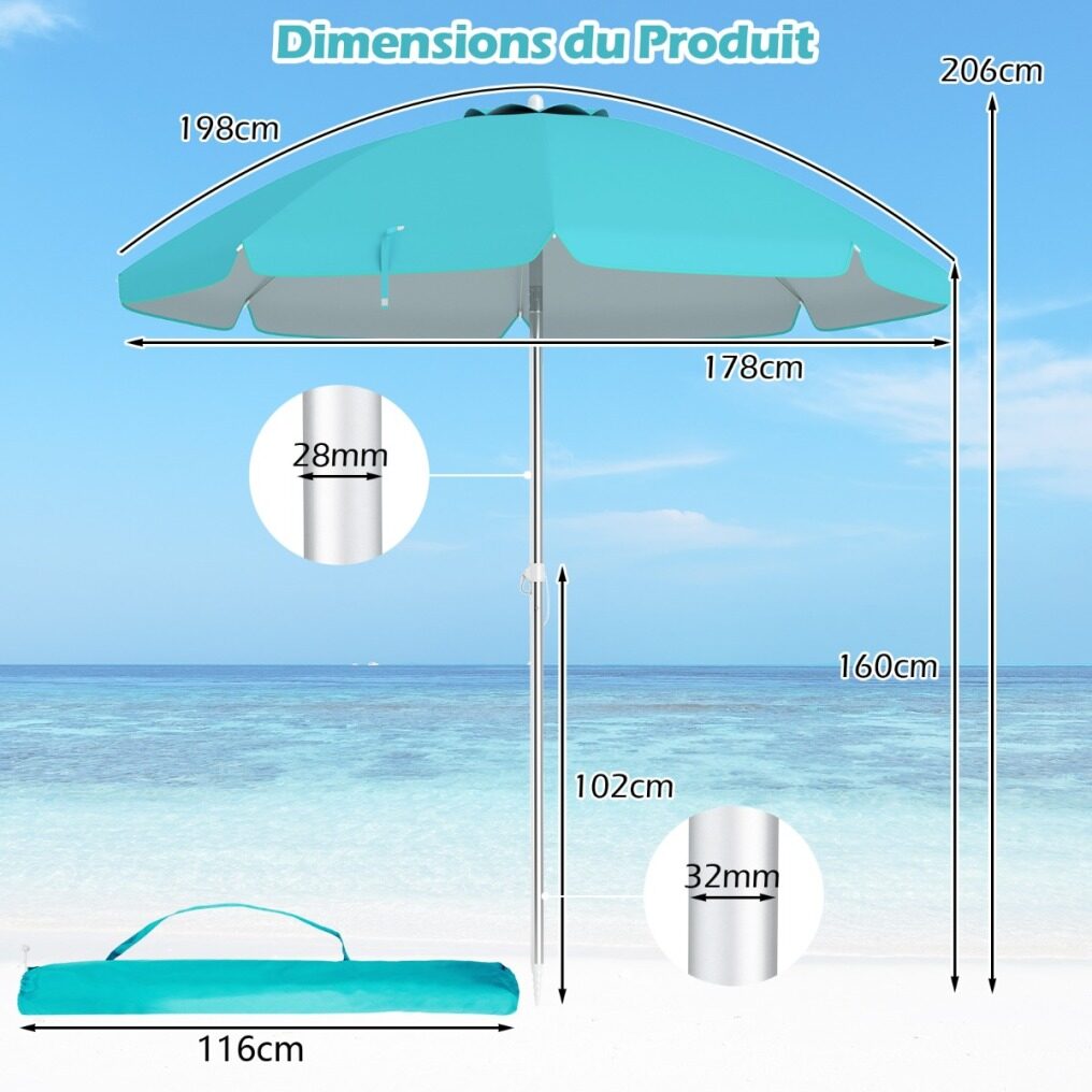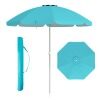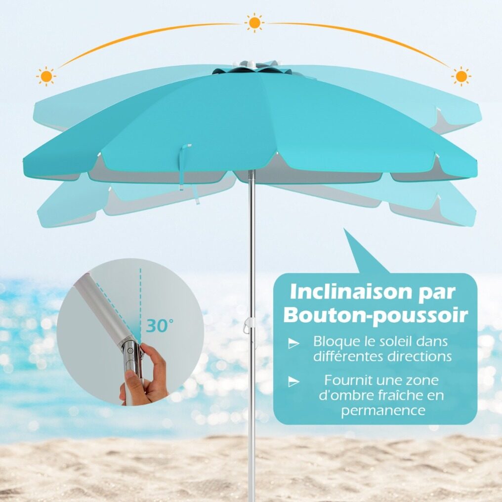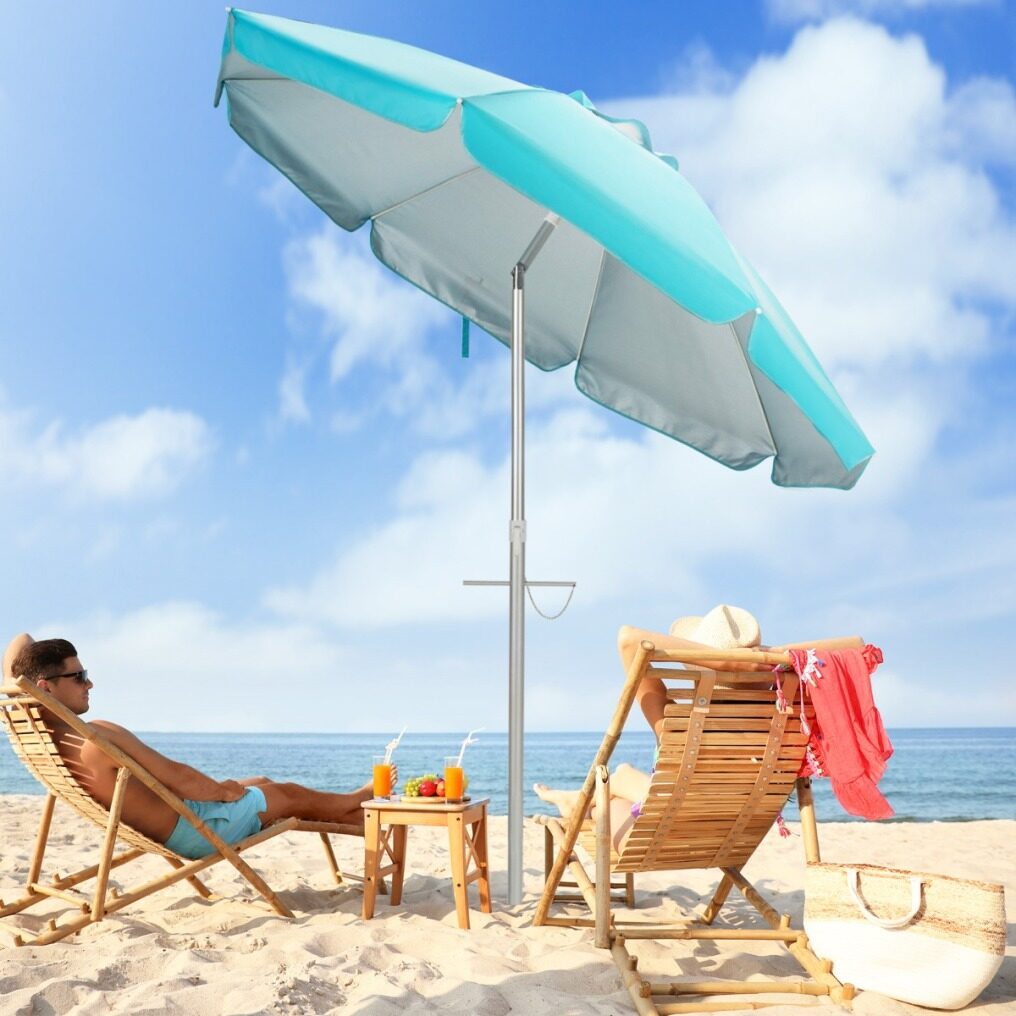 Made with a polyester canopy and silver coating, this 198cm beach umbrella is a barrier against most of the sun's harmful rays. Its convenient push-button tilt function allows you to easily adjust the shade as the sun's position changes. Attachment is simple with a built-in sand anchor and aluminum bolt. Its sturdy design is further enhanced by the rust-proof aluminum pole and strong fiberglass ribs. It's also a great choice for parks, gardens, or any outdoor gathering!