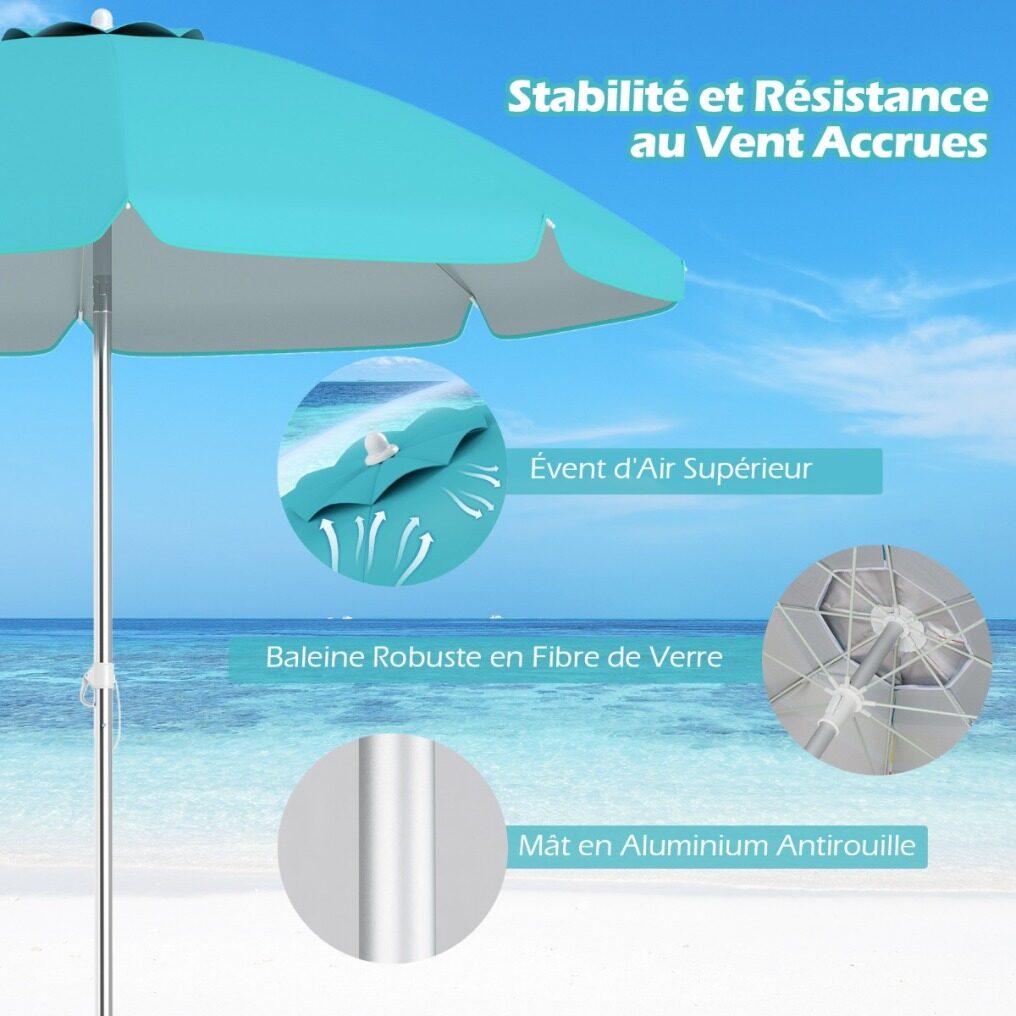 【Enhanced Stability and Wind Resistance】Equipped with a top vent, this beach umbrella facilitates air circulation while improving stability against unexpected gusts. In addition, supported by sturdy fiberglass ribs and rust-proof aluminum pole, it ensures excellent reliability and durability.