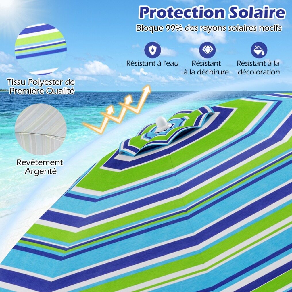 【Enhanced Stability and Wind Resistance】Equipped with a top vent, this beach umbrella facilitates air circulation while improving stability against unexpected gusts. In addition, supported by sturdy fiberglass ribs and rust-proof aluminum pole, it ensures excellent reliability and durability.