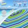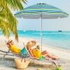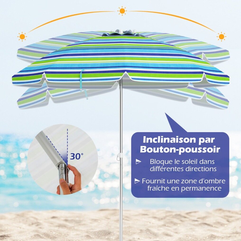 Made with a polyester canopy and silver coating, this 198cm beach umbrella is a barrier against most of the sun's harmful rays. Its convenient push-button tilt function allows you to easily adjust the shade as the sun's position changes. Attachment is simple with a built-in sand anchor and aluminum bolt. Its sturdy design is further enhanced by the rust-proof aluminum pole and strong fiberglass ribs. It's also a great choice for parks, gardens, or any outdoor gathering!