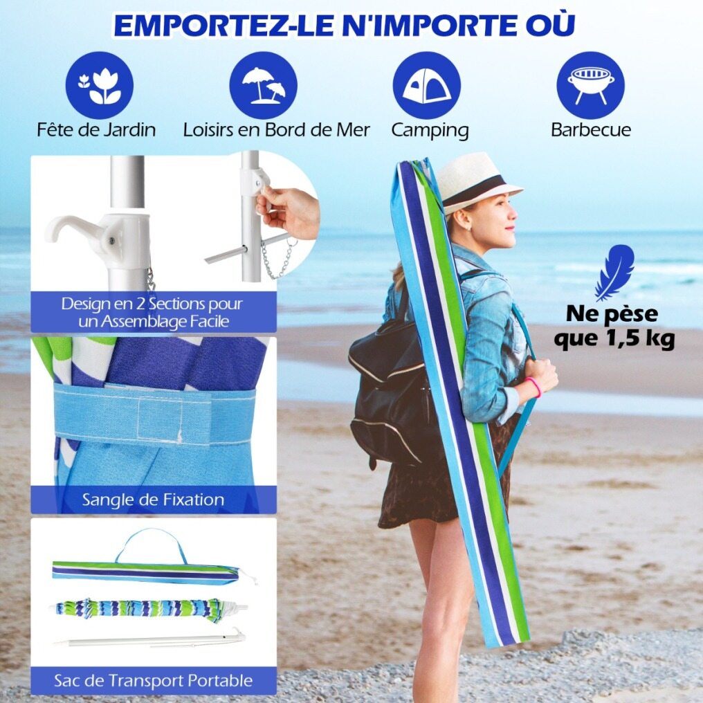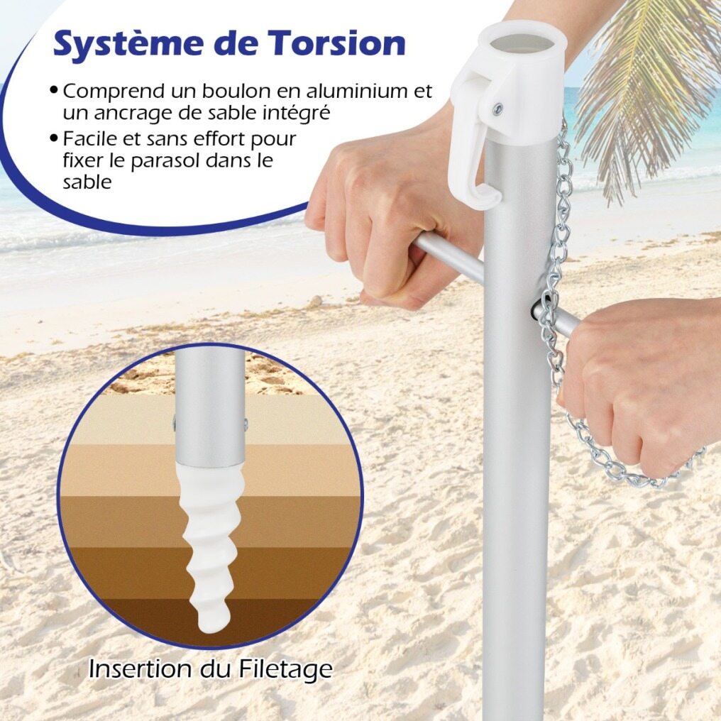 【Easy to fix】The parasol is equipped with a rotation system, including an aluminum bolt and an integrated sand anchor. This practical design allows easy and safe insertion into the sand, ensuring that the parasol remains stable and upright.