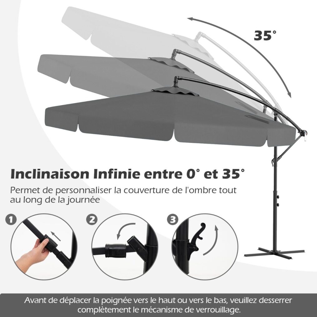 Our 290 cm offset hanging umbrella with a base is a perfect shading solution for your patios, gardens, poolside areas, outdoor events, or even commercial areas, offering a generous shade coverage for various outdoor activities. It includes a protective cover to ensure that your umbrella stays protected when not in use, prolonging its lifespan. The user-friendly crank handle ensures smooth operation, making opening and closing a breeze. Crafted from 180 GSM polyester canopy with a vented top, this cantilever umbrella not only offers superior protection from outdoor elements but also enhances airflow for utmost relaxation. Also, you can tailor your shade throughout the day with our flexible canopy that can tilt between 0 and 35 degrees. Our versatile outdoor umbrella with ruffled edges complements any outdoor setting, from relaxing patio days to vibrant garden gatherings.