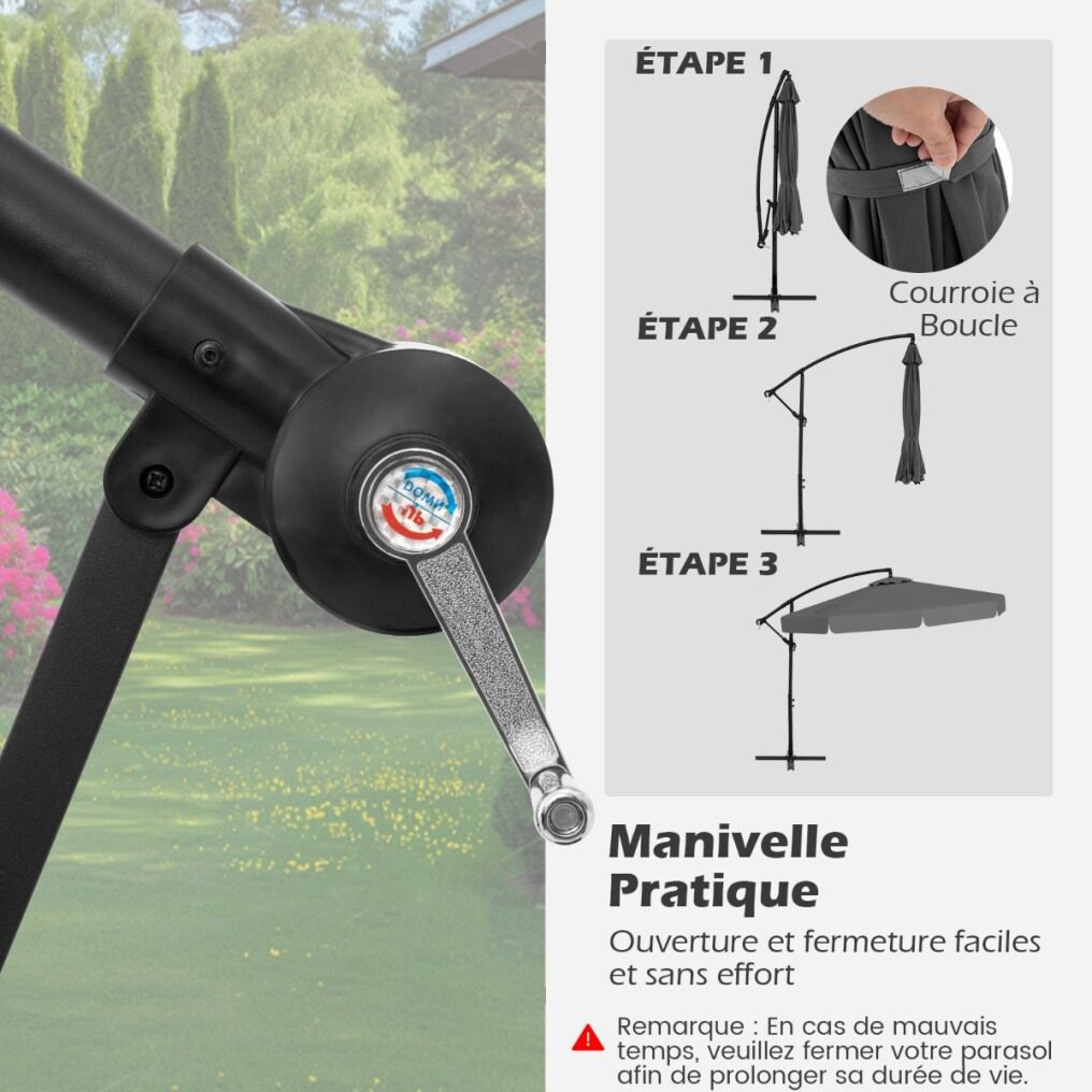 Protective Umbrella Cover Included: This 290 cm offset umbrella comes with a protective cover, featuring zippered enclosure and an elastic hem cord for a snug fit, ensuring your umbrella is shielded from the elements when not in use. Made of waterproof oxford fabric, the umbrella cover is wear-resistant and built to last.