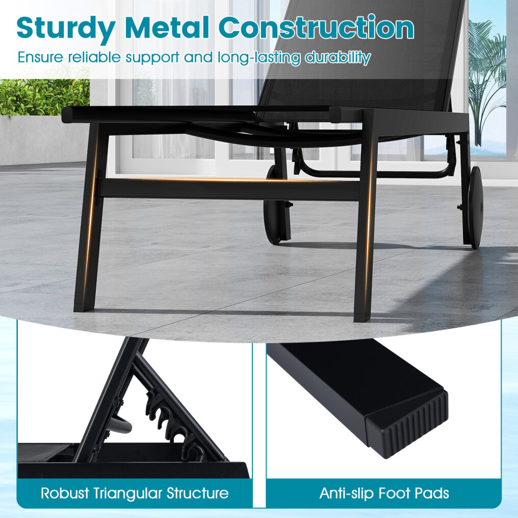 This patio lounger features a sturdy metal frame that provides reliable support and excellent stability, ensuring safe and comfortable use. Its breathable, quick-drying fabric not only enhances comfort but also makes maintenance easy for long-term durability. Equipped with two built-in wheels, the lounger can be easily moved to the poolside, patio, or garden. Furthermore, the 6-position adjustable backrest, including a fully reclined position, allows you to customize your posture from lying down to sitting up.