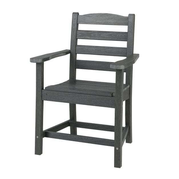 Crafted from high-quality HDPE, the patio dining chair is waterproof and anti-fading. The inclined high backrest offers optimal relaxation for your back and waist. Additionally, its ergonomically contoured seat and wide armrests ensure excellent support and comfort for your body. Furthermore, the chair's sturdy A-shaped frame with reinforced crossbars provides excellent stability. Built with stainless steel fittings, the armchair can adapt to outdoor elements. More than that, the slatted seat design allows airflow and prevents water buildup. Featuring wood-like texture, the outdoor side chair can seamlessly complement your garden, backyard or deck. If you are looking for such a product, do not hesitate to buy it!