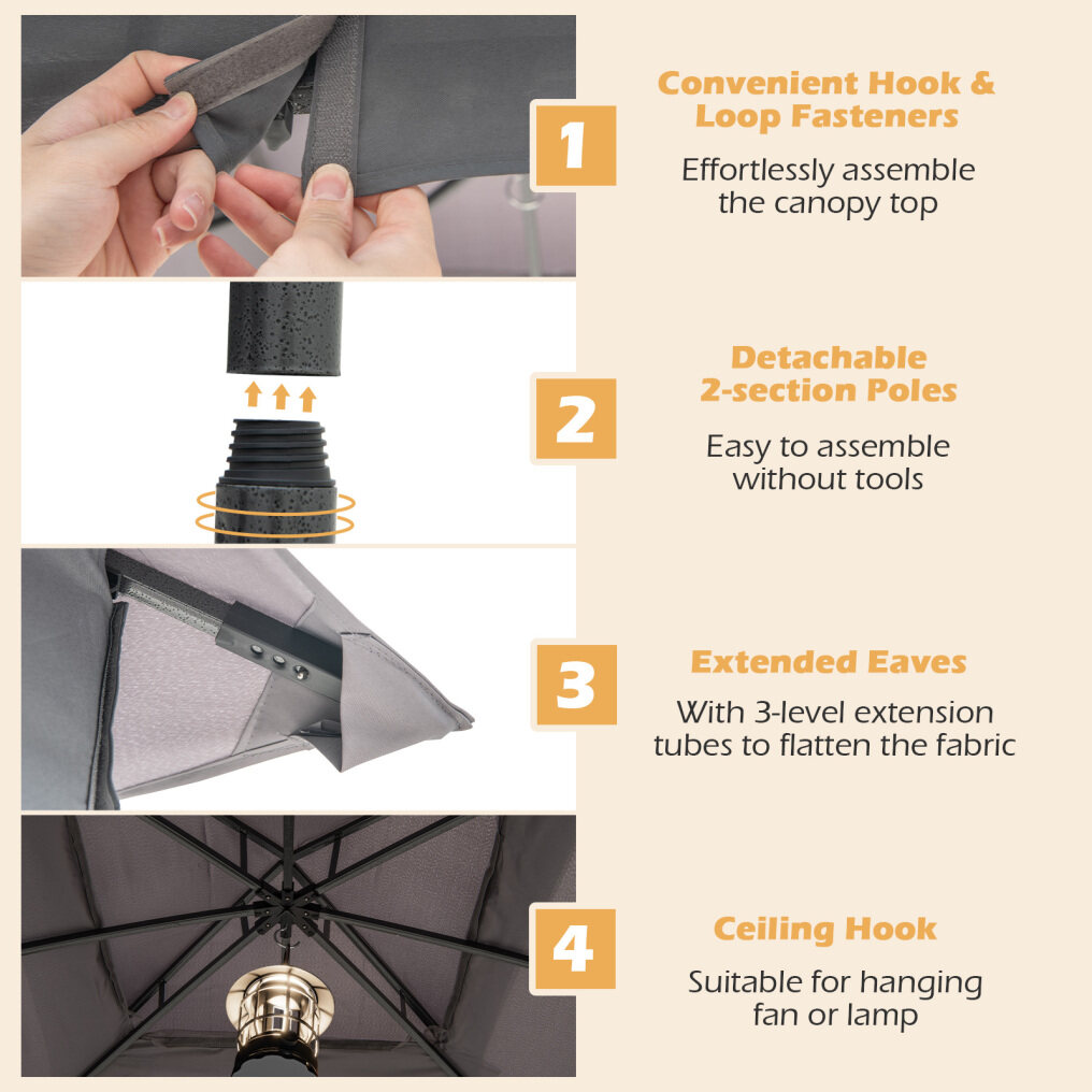 Easy Installation: The patio gazebo support frame consists of 2 sections, boasting a screw-in structure for tool-free assembly. The tent includes 3-level adjustable extension poles at the extended eaves to easily modify and maintain a smooth, wrinkle-free roof.