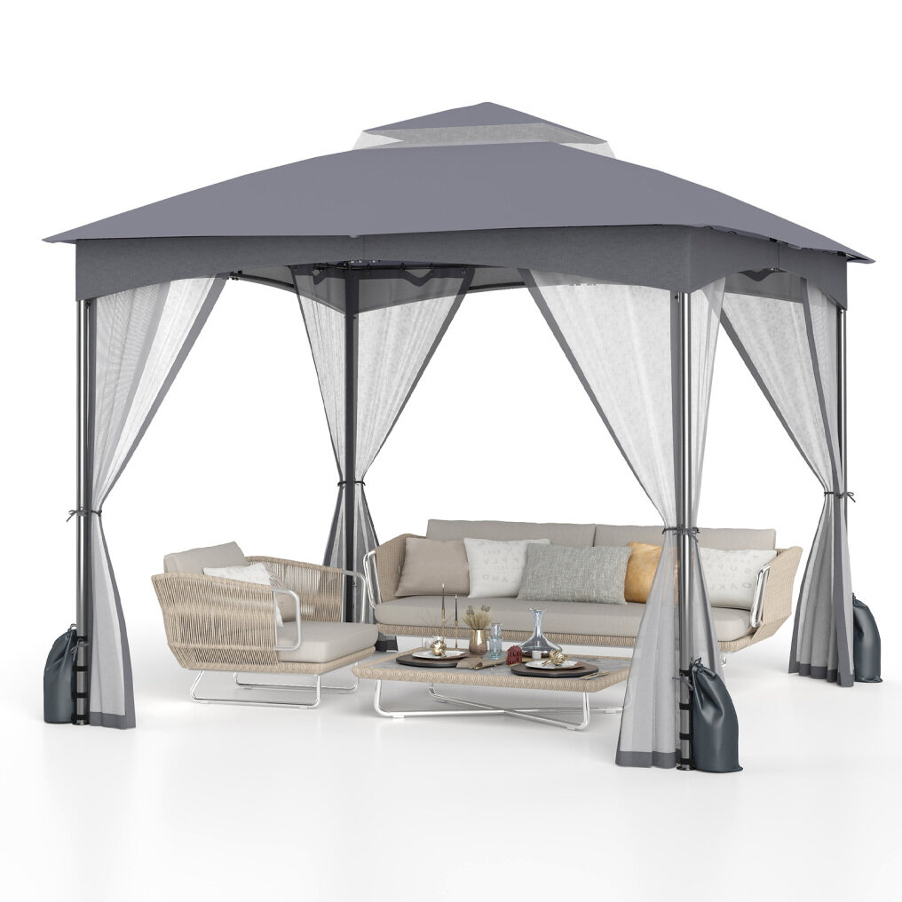Embrace the relaxing oasis with the gazebo and net. The outdoor gazebo measures 300 x 300 x 278 cm (L x W x H), creating a spacious shaded space for a variety of outdoor activities including picnics, parties and commercial events. It features mesh netting on 4 sides, offering a panoramic view and keeping out unwanted guests. The ventilated roof is made of polyester fabric, which will protect you from intense sun and light rain. Additionally, the kit includes 4 sandbags to prevent tipping, which can be filled to add weight, along with bases with anchor plates and 8 metal stakes to firmly secure the structure to the ground. (Note: Please do not use in extreme weather conditions.)