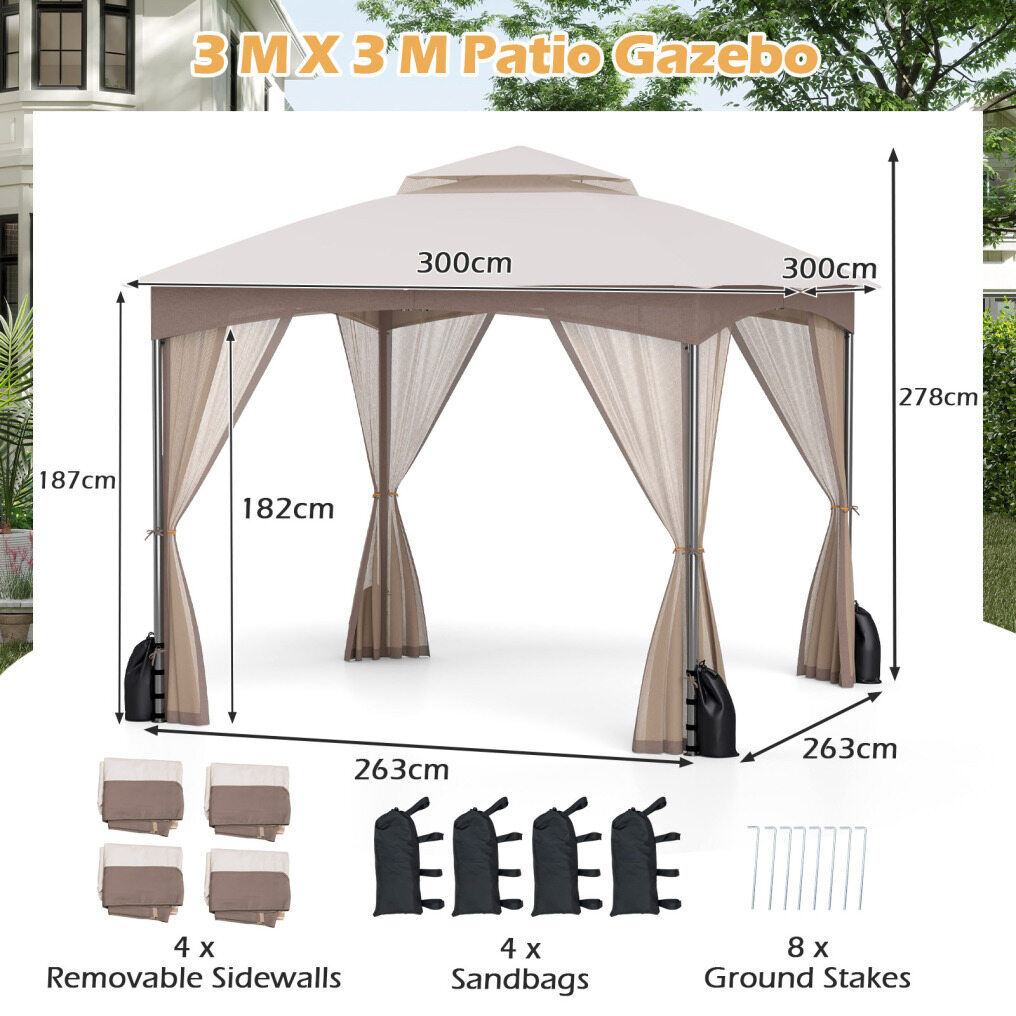Embrace the relaxing oasis with the gazebo and net. The outdoor gazebo measures 300 x 300 x 278 cm (L x W x H), creating a spacious shaded space for a variety of outdoor activities including picnics, parties and commercial events. It features mesh netting on 4 sides, offering a panoramic view and keeping out unwanted guests. The ventilated roof is made of polyester fabric, which will protect you from intense sun and light rain. Additionally, the kit includes 4 sandbags to prevent tipping, which can be filled to add weight, along with bases with anchor plates and 8 metal stakes to firmly secure the structure to the ground. (Note: Please do not use in extreme weather conditions.)