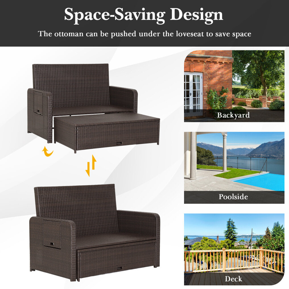 ● Space-Saving Design: When not in use, the ottoman can be pushed under the love seat to save space, leaving more room for other activities. Designed with elegant rattan surface, this patio sofa set will be a decorative addition to various occasions, such as backyard, poolside and deck.