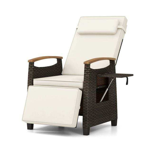 Made from elegant and anti-fade PE wicker, this outdoor recliner chair is designed for long-lasting use and beauty. The 150° adjustable backrest and footrest allow you to find the optimal angle for your comfort, whether you're soaking up the sun or enjoying a nap. The armrests crafted from acacia wood not only add a touch of natural elegance but also offer solid support as you relax. For added convenience, this lounge chair includes a flip side table, perfect for holding your drinks, books, or other essentials within easy reach. The long cushion with thick and soft fillings provides comfortable support and the removable head pillow provides added comfort. If you are looking for such a product, do not hesitate to buy it!