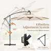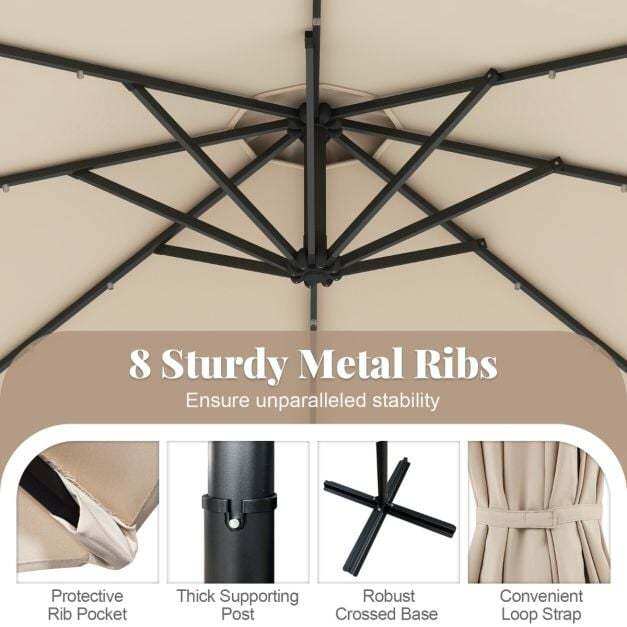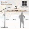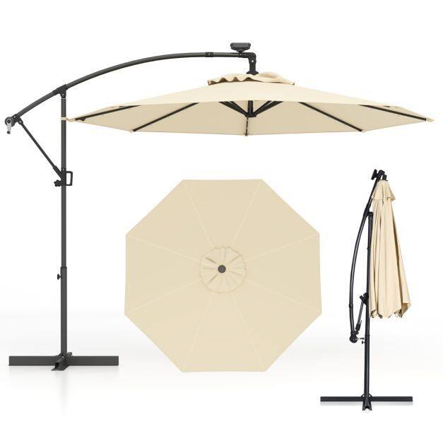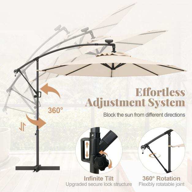 Elevate your outdoor experience with this solar powered offset hanging umbrella, designed to illuminate your patio and summer nights. Featuring 32 light beads, this LED-lighted umbrella enhances your outdoor ambiance. The cantilever umbrella features tilt adjustment, allowing you to align it with the sun's movements for optimal shading and comfort. The 360-degree rotatable joint allows you to adjust the canopy and rotate it 360°. Additionally, the polyester fabric canopy provides better sun protection. The hanging umbrella's sturdy structure, comprising 8 metal ribs, an aluminum pole, and a cross base, ensures exceptional durability and stability. Its generous size provides ample shade for lounging and dining areas, enhancing your outdoor living experience. If you are looking for such a product, do not hesitate to buy it!