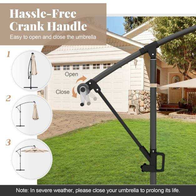 Crank and Tilt Mechanism: The outdoor cantilever umbrella features a convenient crank lift system, allowing you to effortlessly open and close it as needed. Plus, the patio umbrella features 35° inclination, enabling you to set the proper angle to block the sunlight and provide shade exactly where you need it.