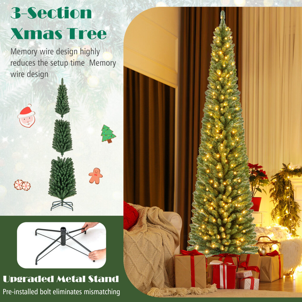 Pencil Christmas Tree with Memory Wire Branch Tips and Warm LED Lights-8FT