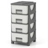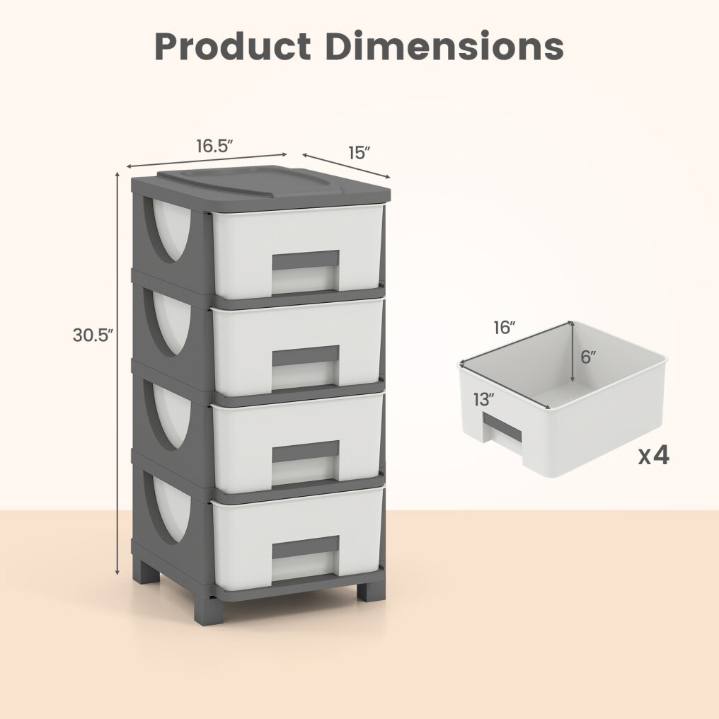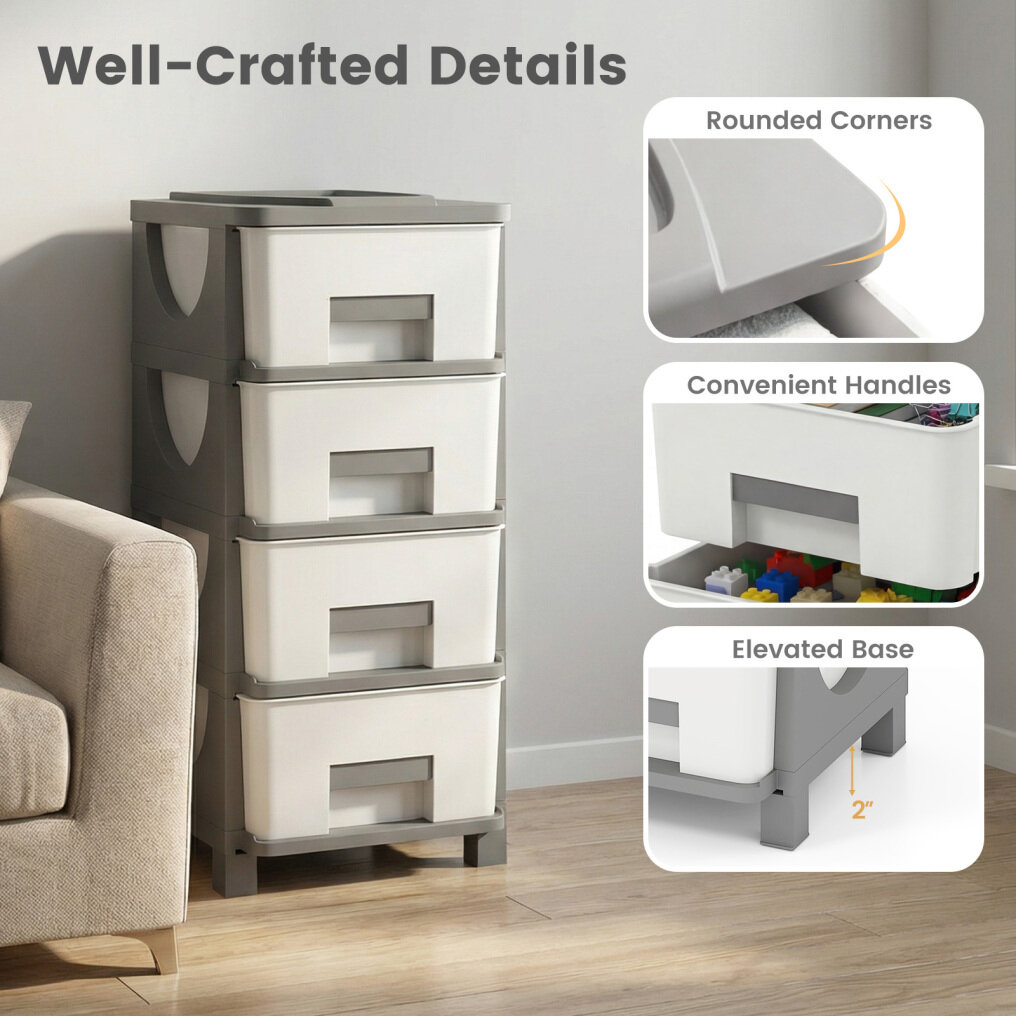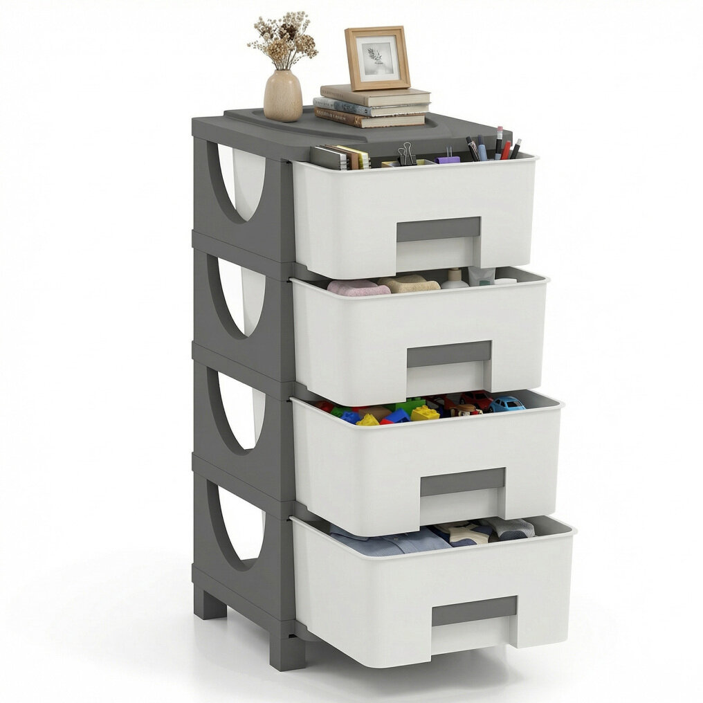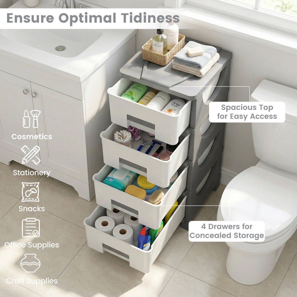● Versatile Organization: This practical plastic storage organizer features 4 drawers for concealed storage and a spacious top for easy access. It perfectly holds cosmetics, stationery, snacks, office supplies, and craft supplies, ensuring optimal tidiness.