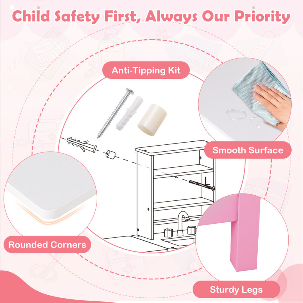 ● Superior Safety for Worry-Free Play: Every detail of the medical center play set is crafted with safety in mind, featuring an anti-tipping kit, rounded corners, and a smooth surface to prevent scratches or bumps. Supported by sturdy legs, parents can feel at ease while children explore and interact, knowing safety comes first.
