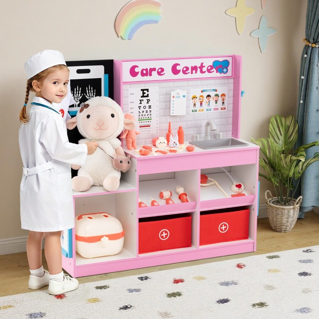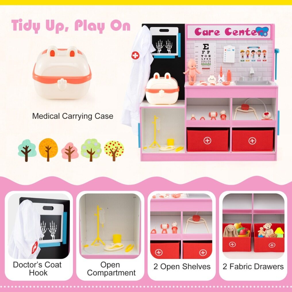● Tidy Up, Play On: The pretend hospital playset comes with a medical carrying case to hold 29 included medical accessories. With a handy doctor's coat hook, accessible open compartment, 2 open shelves, and 2 fabric drawers, every tool has its place.